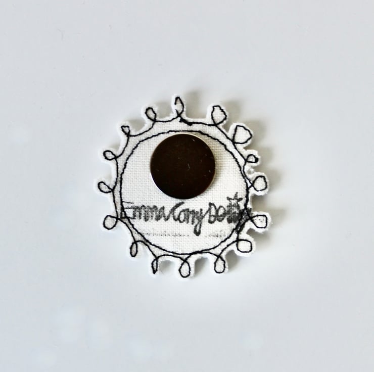 Each magnet is created using multiple layers of cloth, sewn using freehand machine embroidery and then cut out by hand. The magnet on the back is attached with hot glue.