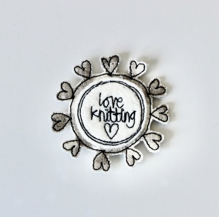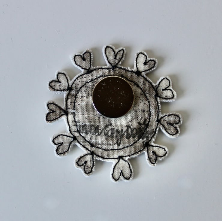 Each magnet is created using multiple layers of cloth, sewn using freehand machine embroidery and then cut out by hand. The magnet on the back is attached with hot glue.