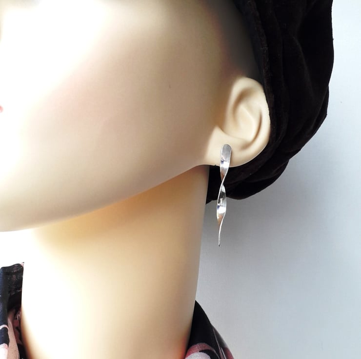 Long drop twisted sterling silver earrings with a stud fitting.