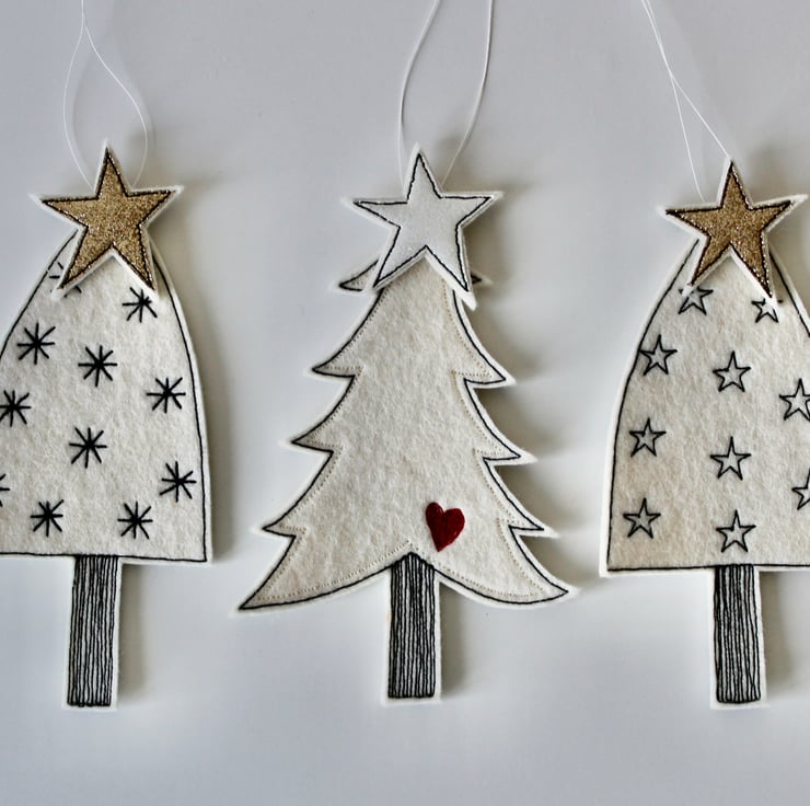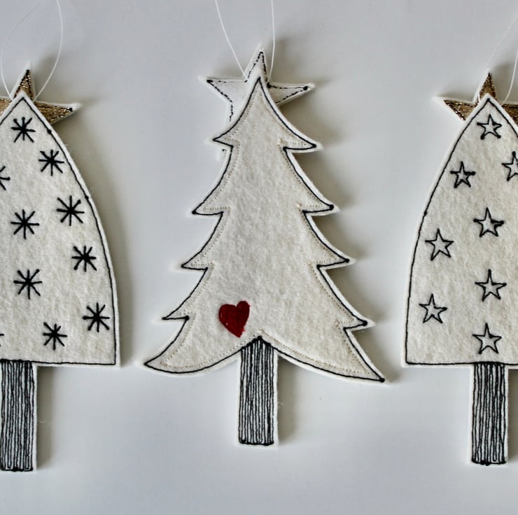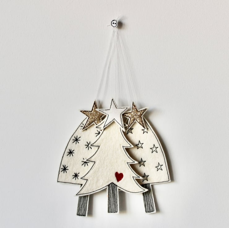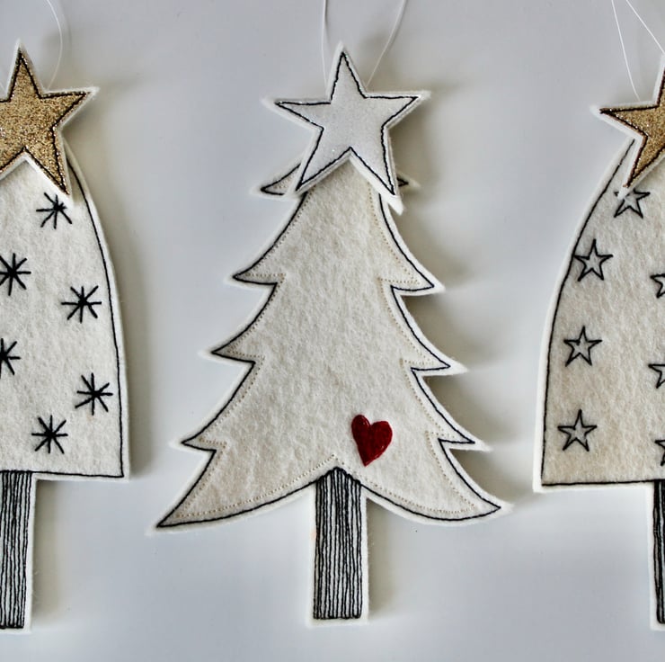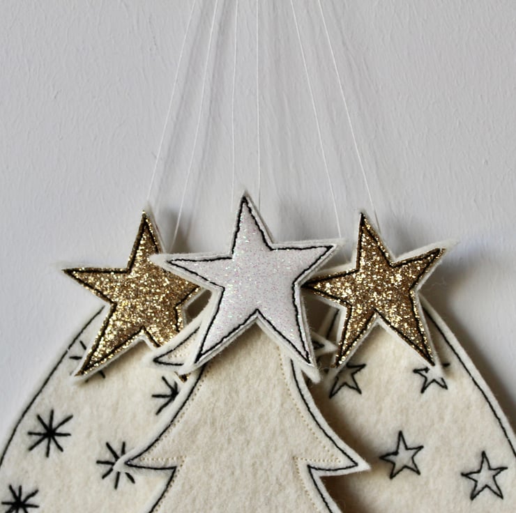 Delightful hanging decorations which are created using 100% wool felt, glitter cloth, free hand machine embroidery and cut out by hand, using a very sharp pair of scissors.