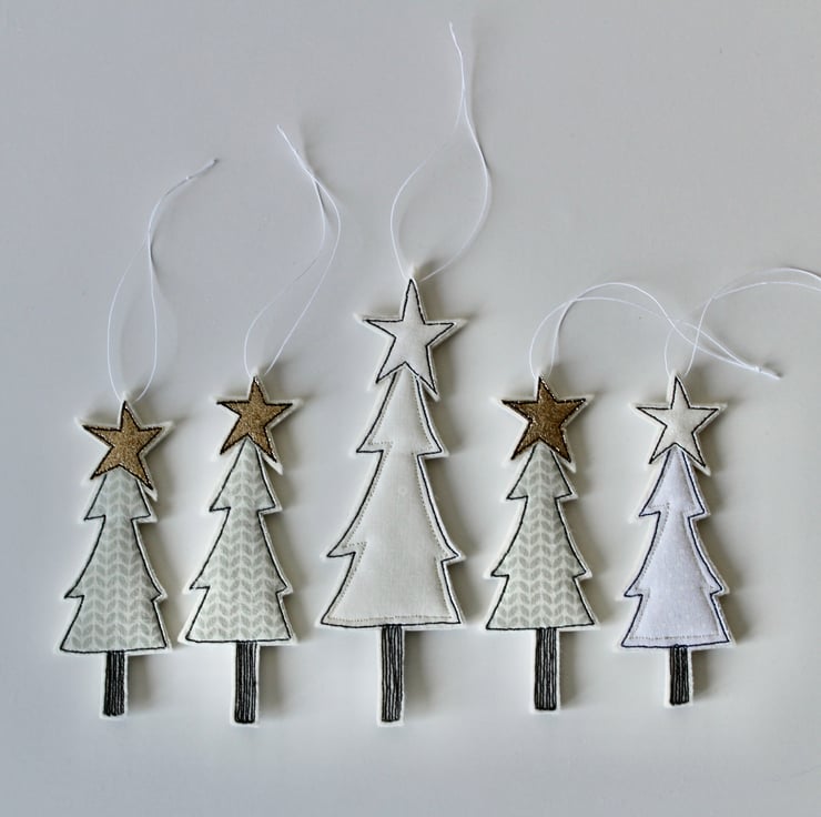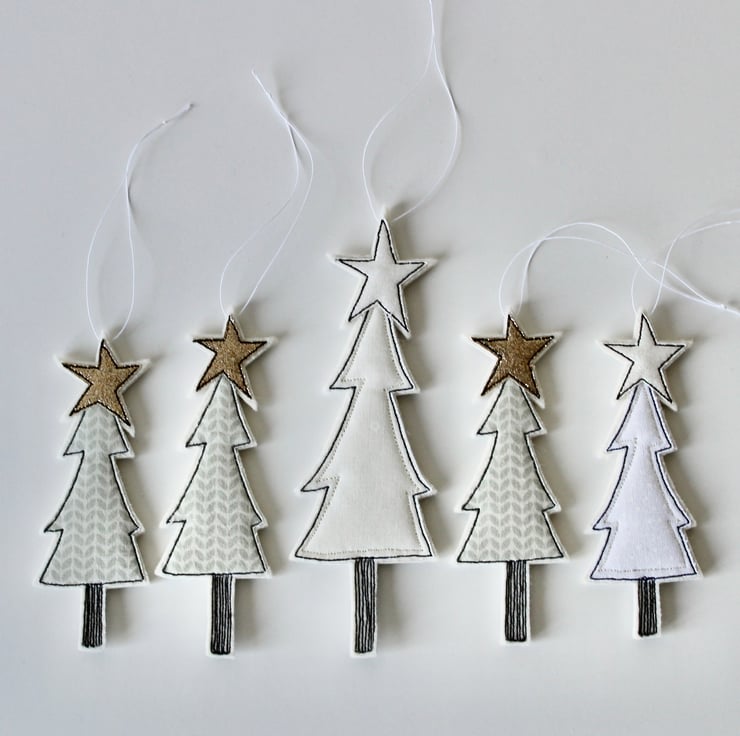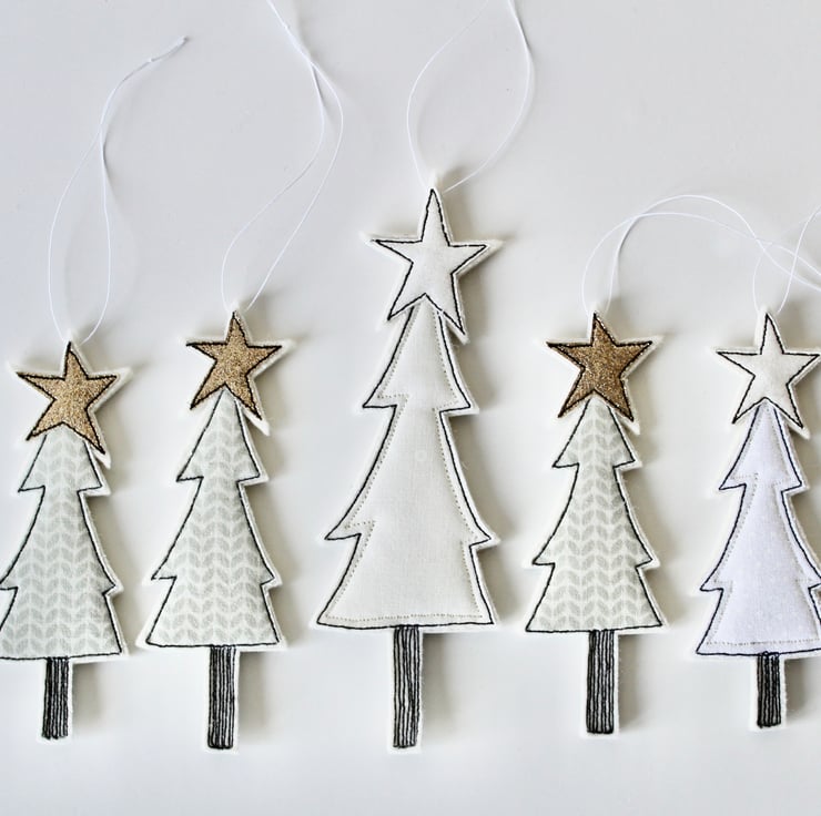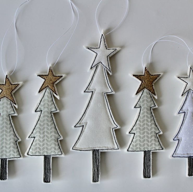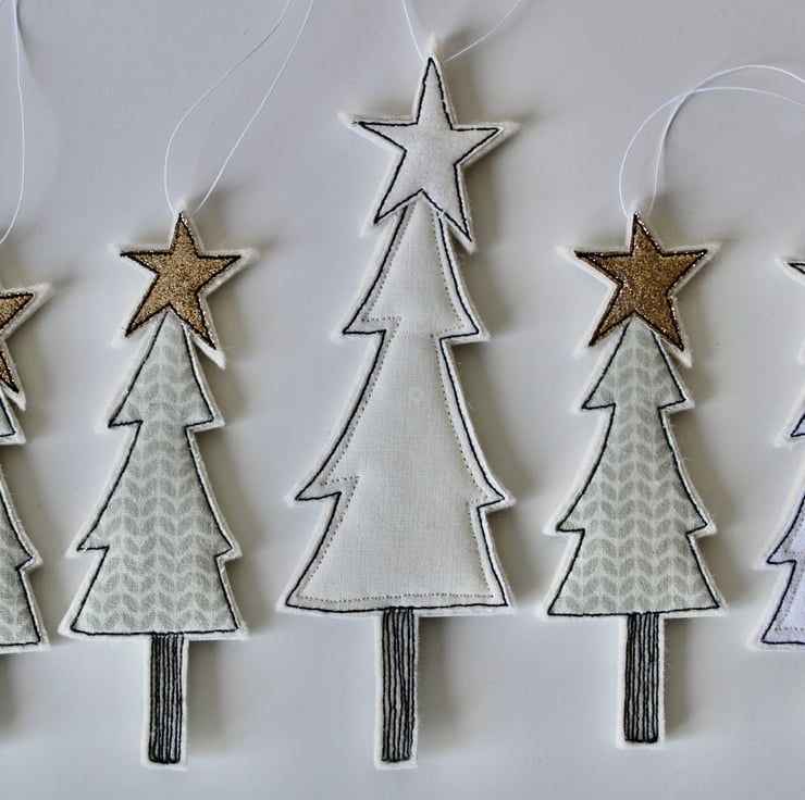 Delightful hanging decorations which are created using 100% wool felt, cotton cloth, glitter cloth, free hand machine embroidery and cut out by hand, using a very sharp pair of scissors.