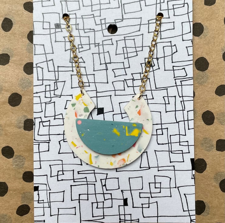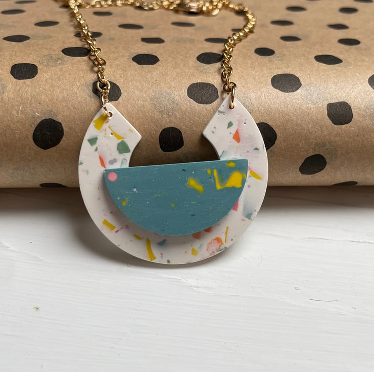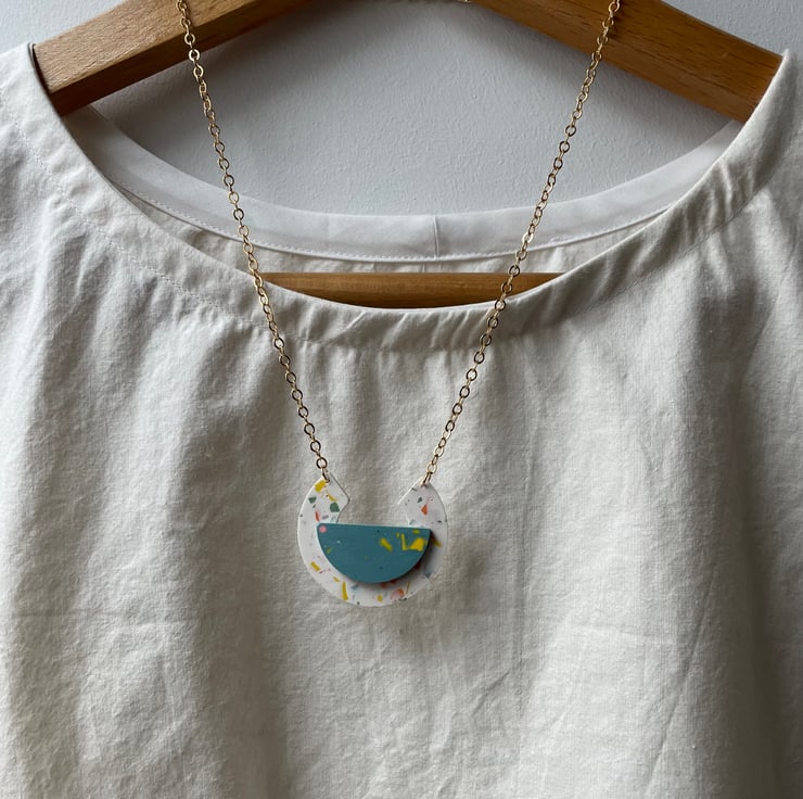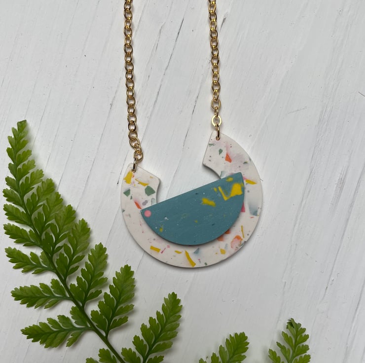Gorgeous statement necklace, in yellow and purple. Featuring layered circles in terrazzo style Jesmonite. A base of white with colourful terrazzo chips, with a complimentary semi-circle of blue with yellow and pink terrazzo chips and finished on a 3mm gold plated chain.