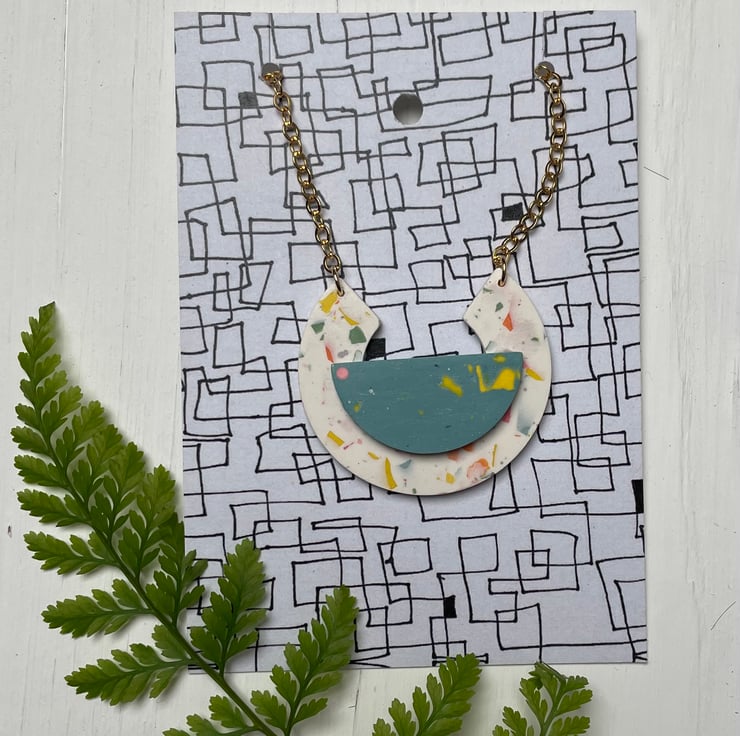 This is a simple necklace, but makes a big statement to an outfit. Colourful and bright with multicolour terrazzo finished on a gold plated chain.