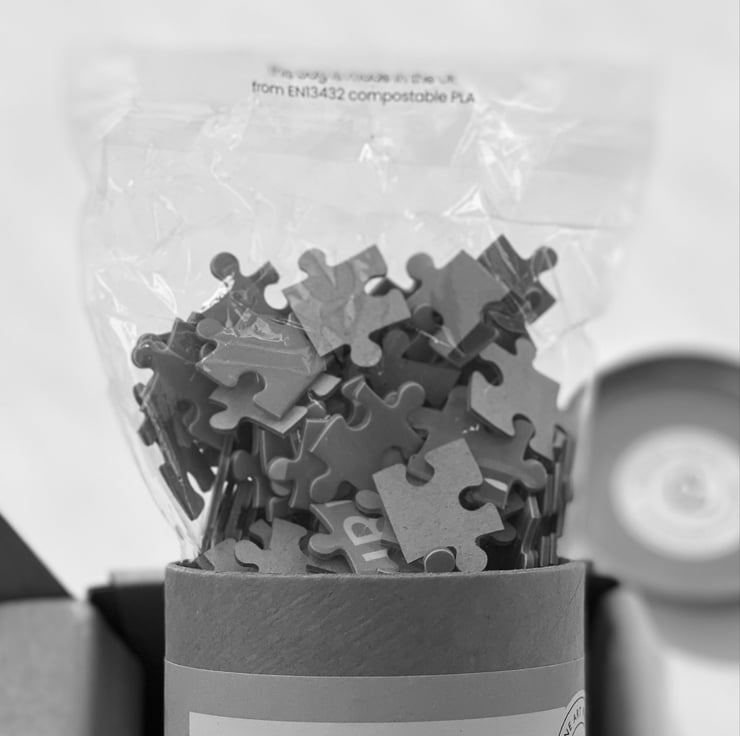 This lovely puzzle is made from 2 mm thick sturdy cardboard, it is printed onto the cardboard using dye sublimation, this ensures the inks are fused deep into the fibres of the material and create a lasting print. The puzzle is supplied in a cardboard tube made from recycled paper with gold metal end caps. The labels are printed upon recycled, 100% post consumer waste, FSC certified paper which is chlorine-free. The jigsaw pieces are held within a clear bio-degradable and compostable bag. My goal has been to create an eco-conscious, sustainable gift.