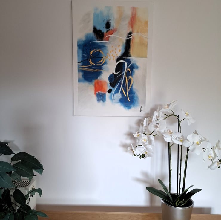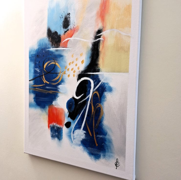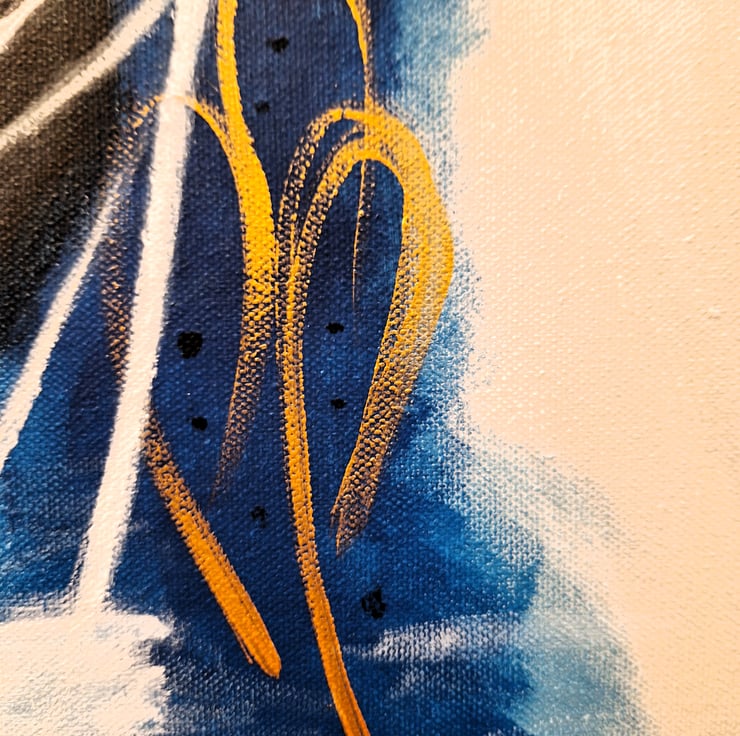 I really enjoyed expressing myself on this painting, trying out various brush strokes, using a palette knife to blend the background or drag colours down and a few swirls in gold paint. I painted a white border on the canvas to accentuate and make the colours pop.