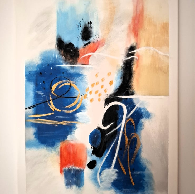This one of a kind and unique piece of contemporary art which would look fantastic hanging on the wall of any home, or office workspace. The geometric shapes and strong colours combine to make the painting look incredibly modern.