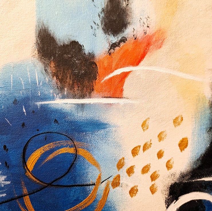 I really enjoyed expressing myself on this painting, trying out various brush strokes, using a palette knife to blend the background or drag colours down and a few swirls in gold paint. I painted a white border on the canvas to accentuate and make the colours pop.
