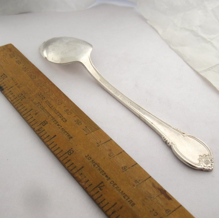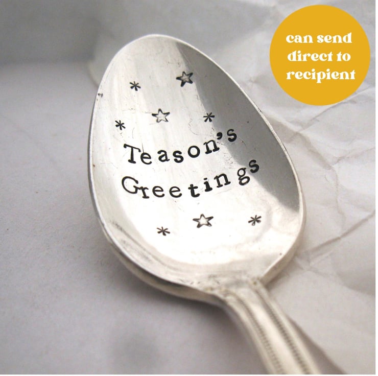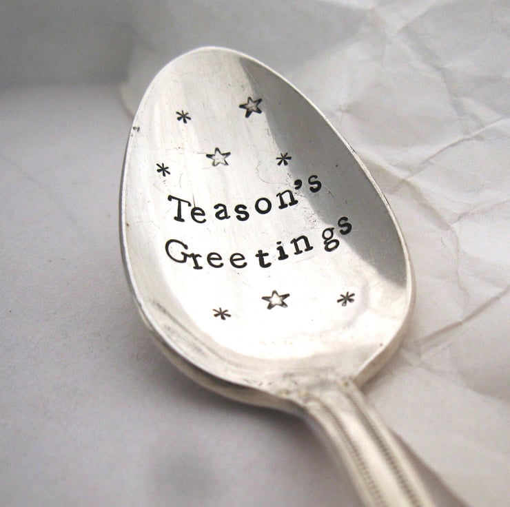A large teaspoon or small dessertspoon with a floral handle and the words 'Teason's Greetings' hand stamped in the bowl along with some stars and snowflakes. It's a vintage silverplated spoon approx. 16cm long. The handstamped wording is coloured black with water-based acrylic paint. Hand wash with care.
