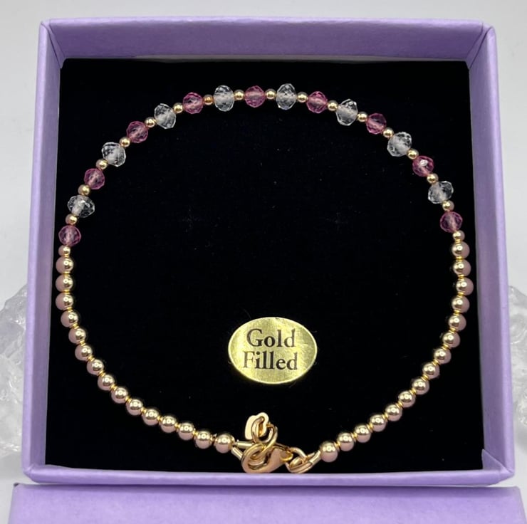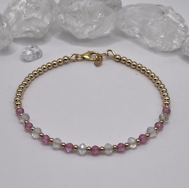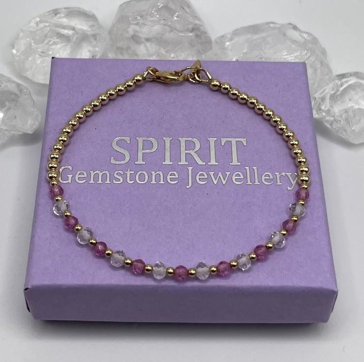 Hand made 14ct gold filled bracelet with pink sapphires and AA grade quartz crystals finished with a lobster clasp and heart shaped hall mark tagg.