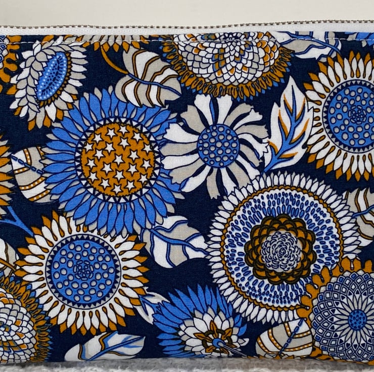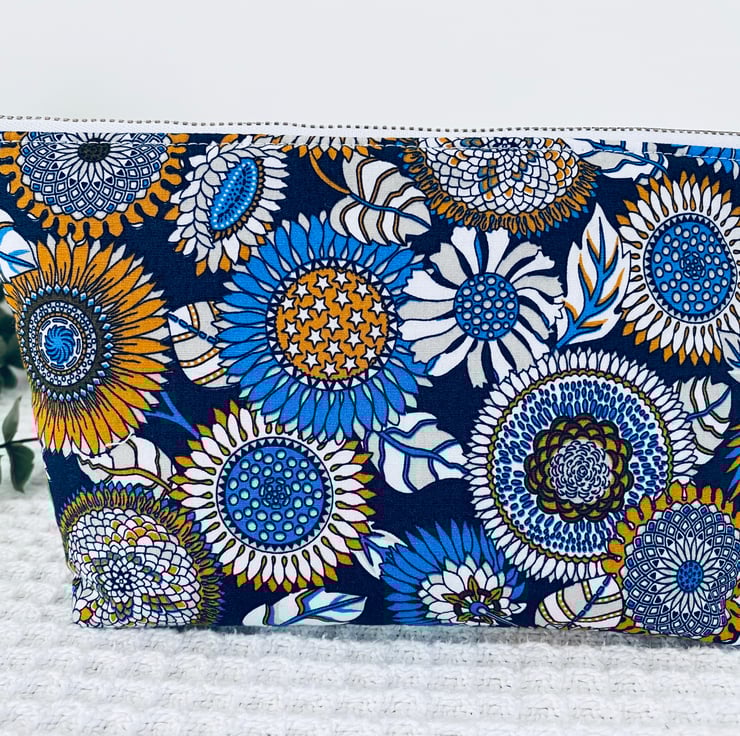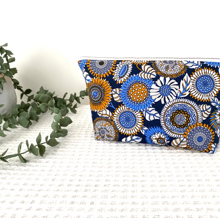 Make up pouch made from a vibrant poly cotton fabric and lined in water resistant rip stop. Made with a metal zip and a faux suede pull and measures approximately 9” wide x 5”