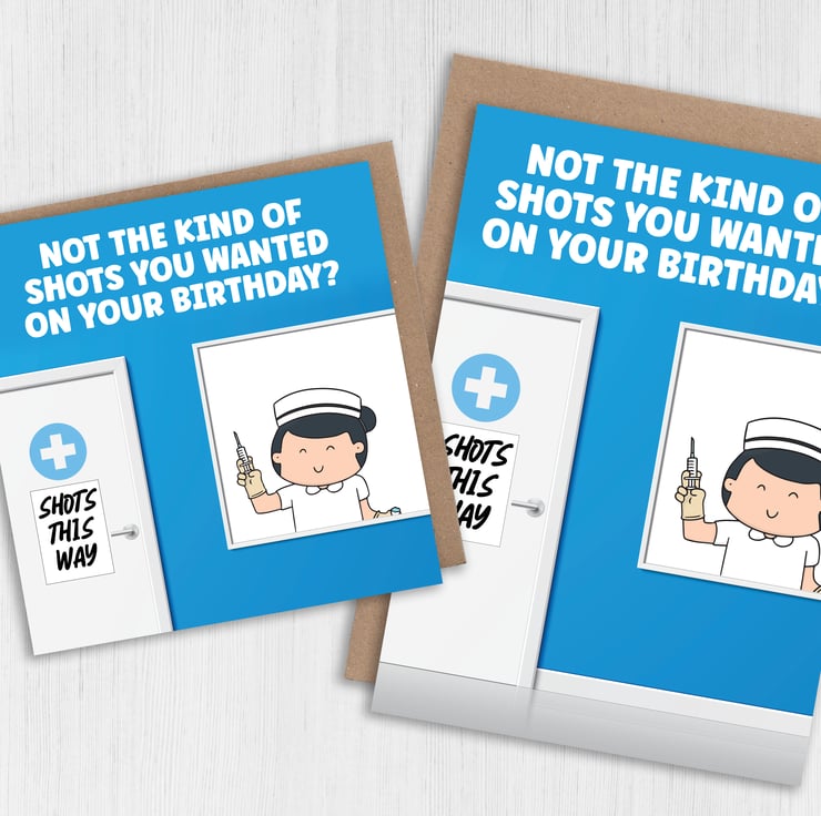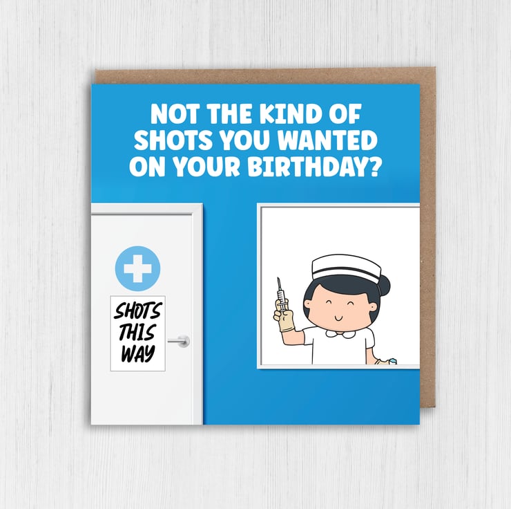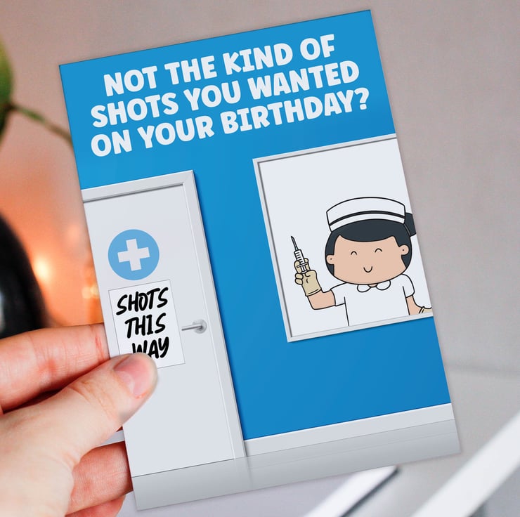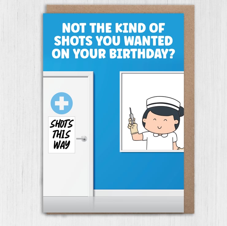 Not the kind of shots you wanted on your birthday? Funny birthday card, flu jab, shot, alcohol, drinking (Size A6/A5/A4/Square 6x6")