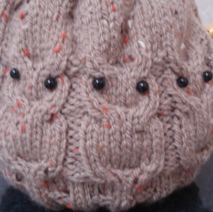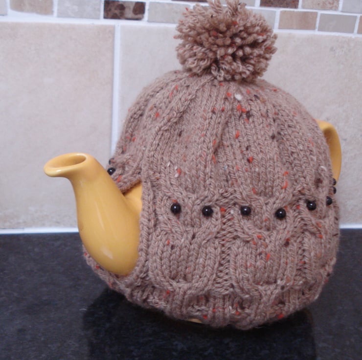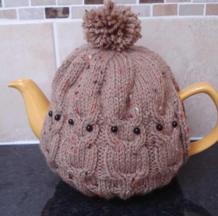 This is a 4-6 cup tea cosy hand knitted in a chocolate brown Aran yarn. The yarn has flecks of red and dark brown. The owls have black plastic beads for eyes and topped of with a pom pom.