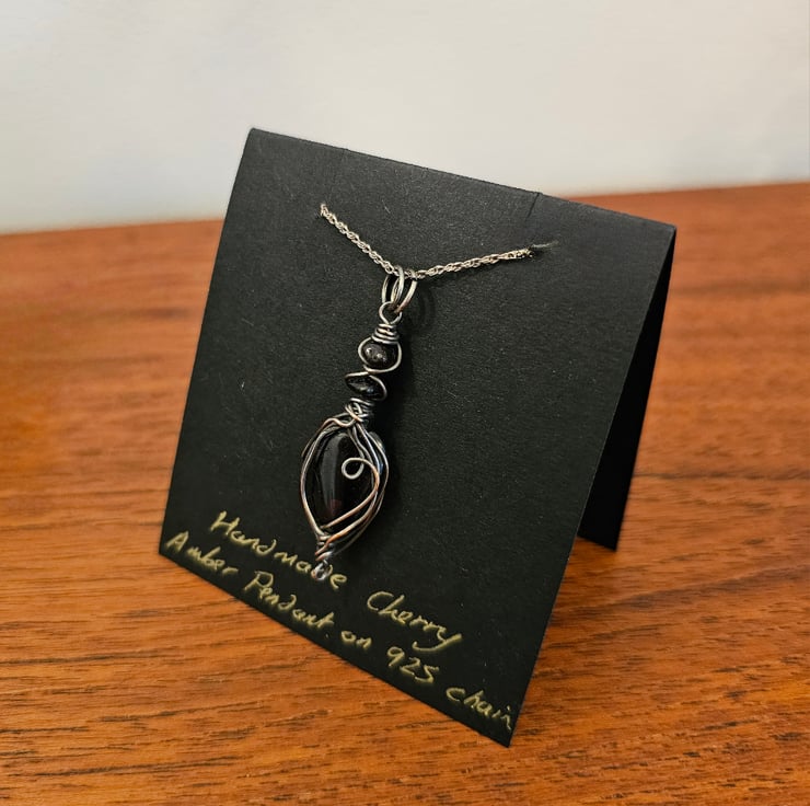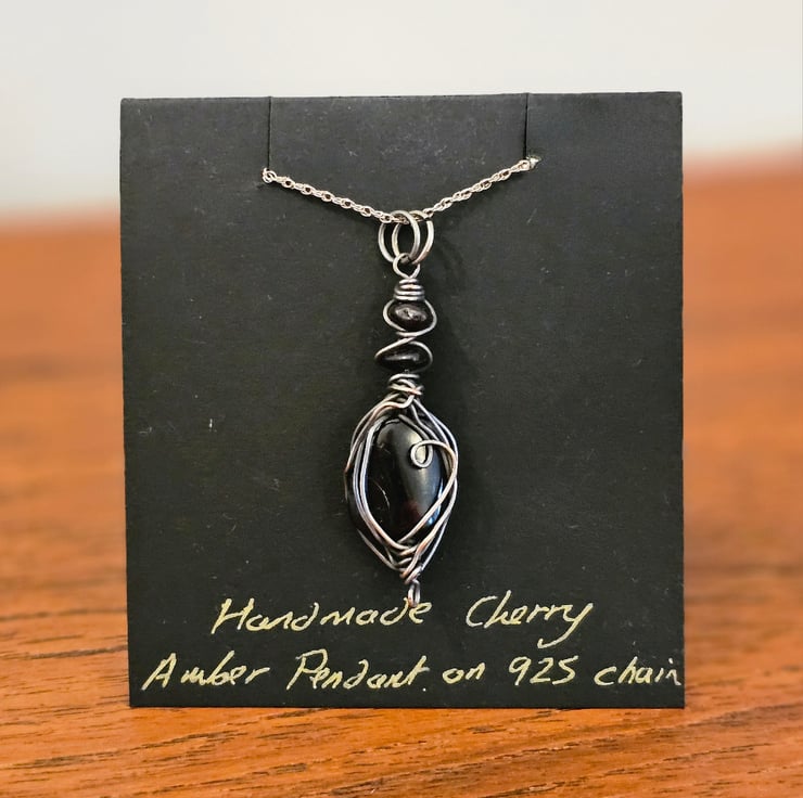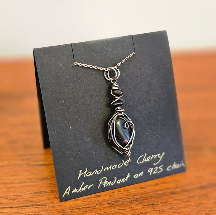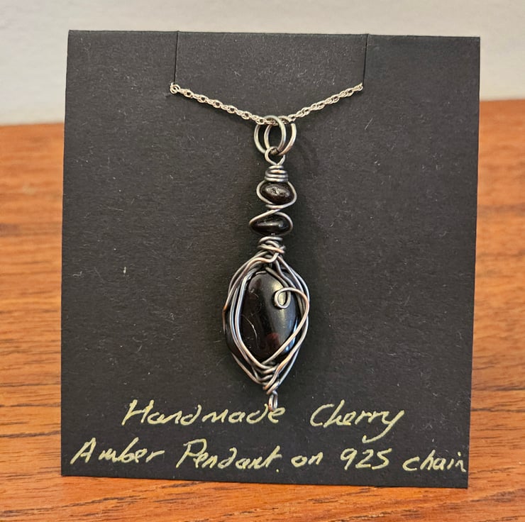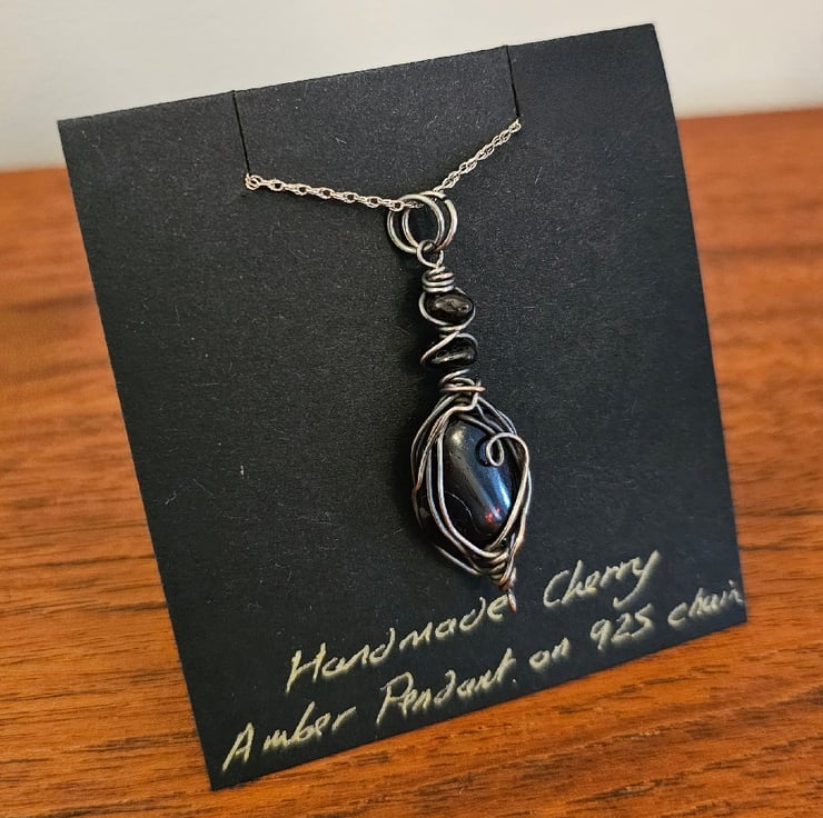 Beautiful cherry Amber wrapped in good quality Silver Plated copper wire on an 18 inch 925 Sterling silver chain. I have then treated the necklace with oxidising solution to give it a beautiful Vintage effect.
