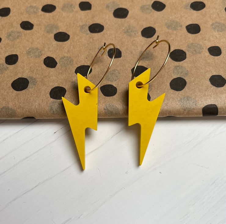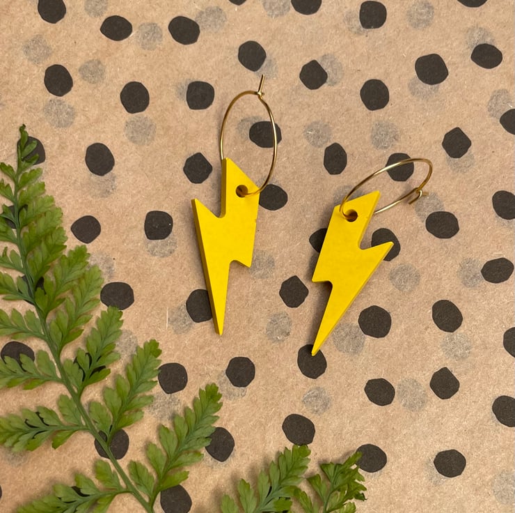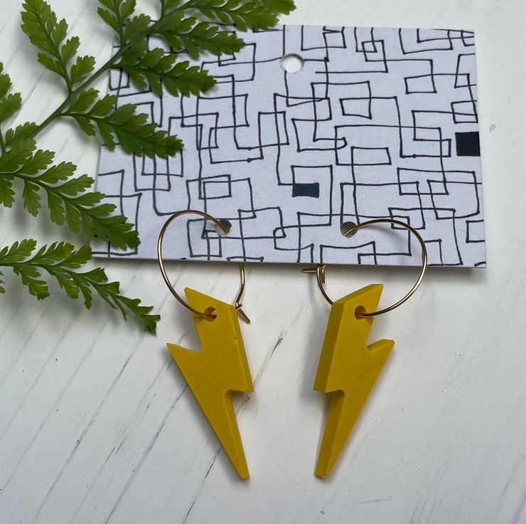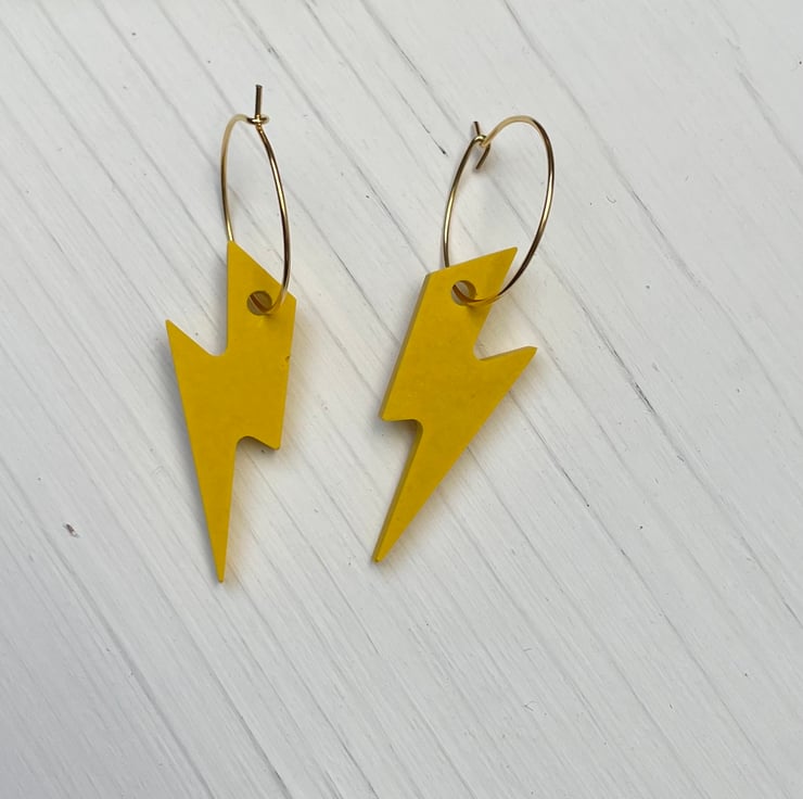 Cute lightning bolts cast in yellow Jesmonite finished on a gold plated 20mm hook latch hoop.