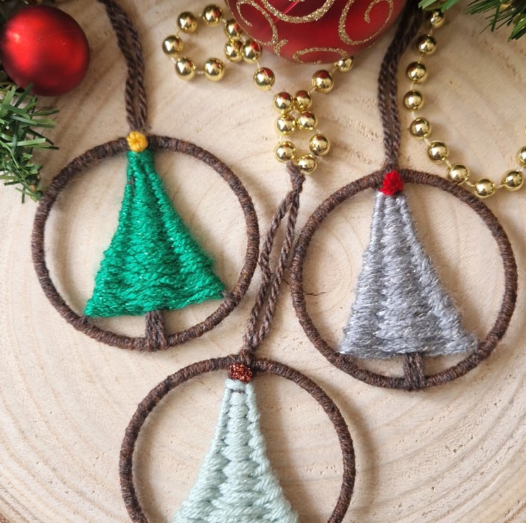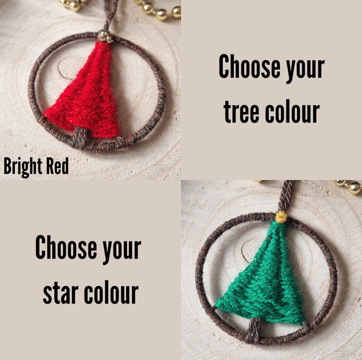 Handwoven Christmas Tree ornaments created using sparkly yarns! These little decorations are created within 7cm hoops, with each tree topped with a 'star' of your colour choice! These ornaments have a loop ready to hang on your Christmas tree!