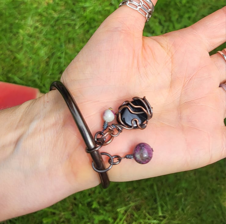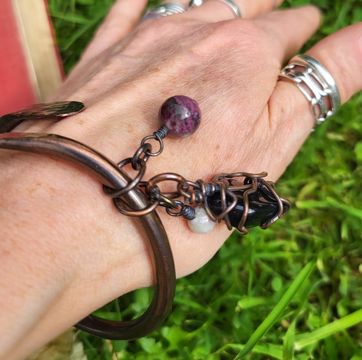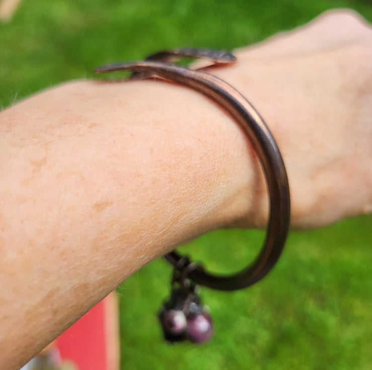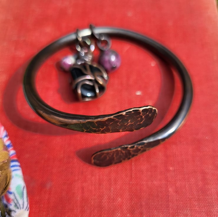Elevate your style with my exquisite handmade textured copper bangle with hanging gemstones. This delightful bracelet adds a touch of rustic charm to any outfit, whether worn alone or layered with other bangles of different colours and textures. Its unique design allows you to create an up-to-the-minute layered look, perfect for adding a splash of rustic charm an to your outfit. Crafted with care and attention to detail, this bangle showcases the perfect fusion of rustic charm and contemporary style. Stand out from the crowd with this stunning accessory that brings a touch of elegance and individuality to your everyday look.