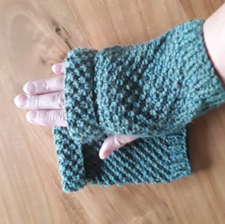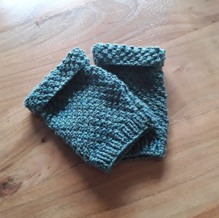 Fingerless gloves in sage green colour. Has ribbed wrist edge and chunky rolled top at finger edge.