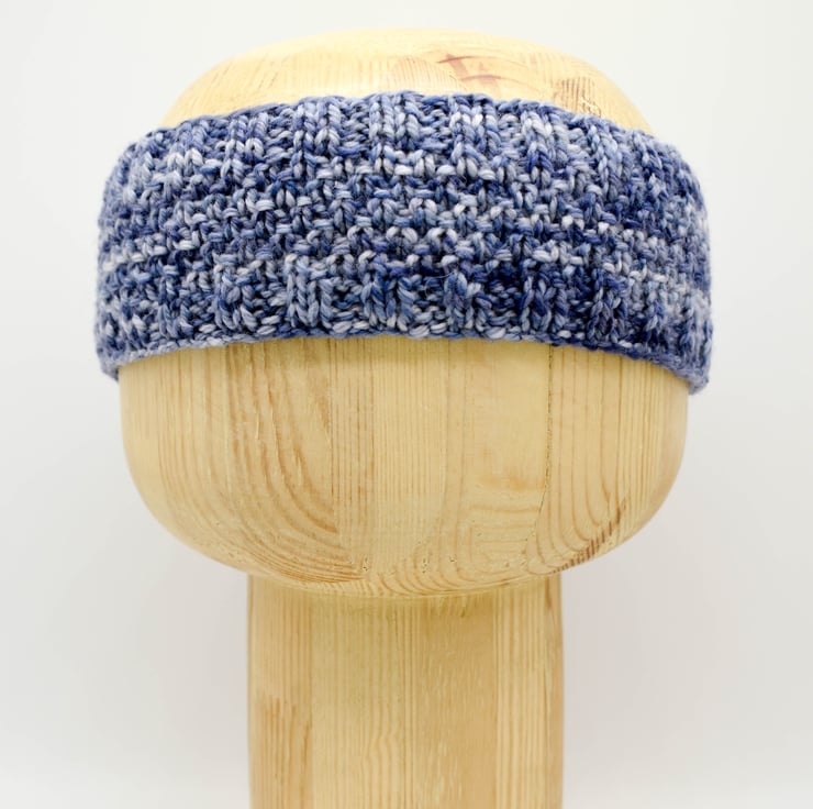 Knitted in beautifully soft merino yarn in a denim blue variegated colour-way. It is shaped to be wider around the back of the head and over the ears and then narrower at the front. This cosy unisex headband can be worn either on it's on or even under a cycle helmet to help keep your ears warm.