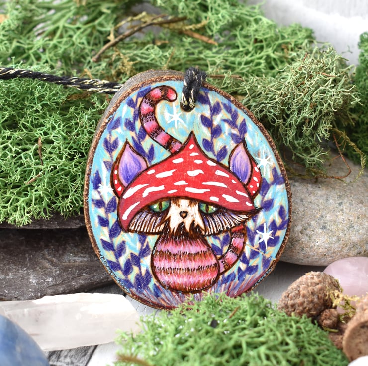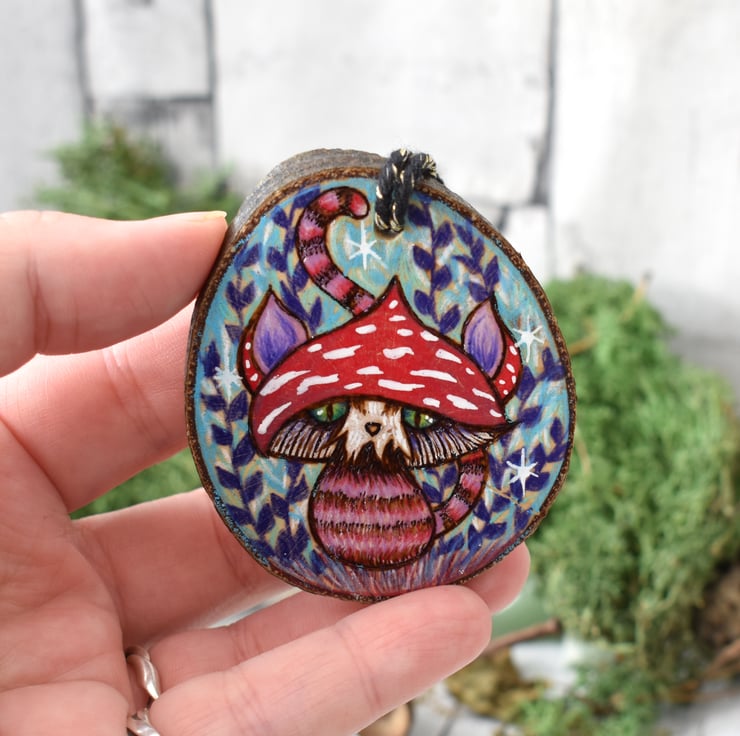 A hand burned pyrography wood slice decoration, with a fungi cat design, completely unique!