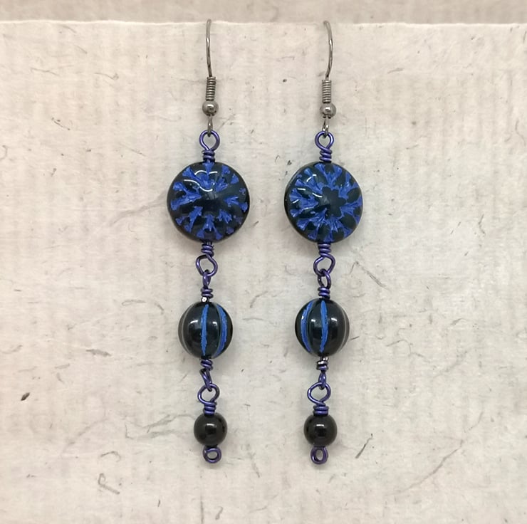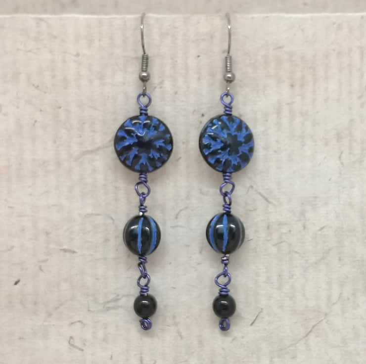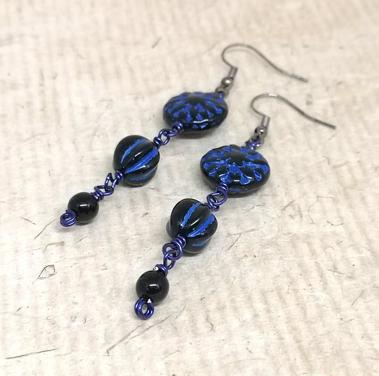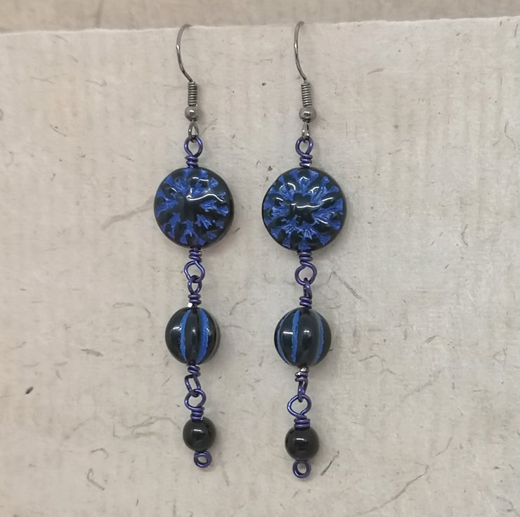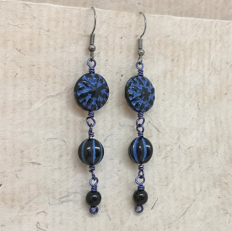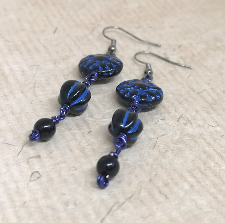 These earrings feature a trio of black Czech glass beads. The top two beads have detailing picked out in a pretty shade of blue and I've used blue wire to create the links to compliment this. They've been attached to gunmetal grey ear wires.