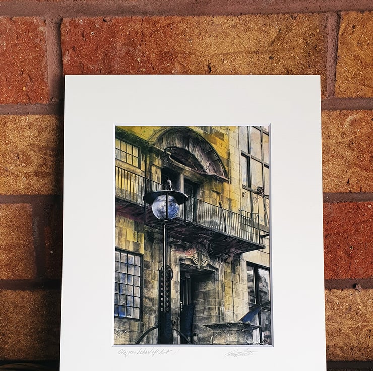Detail of Glasgow School of Art, photograph with watercolour overlay . 5 x 7inch print mounted in a 9 x 7inch ice white acid free matt ready to frame. Your print will be numbered up to 250. Display these fine art photographs in your living / office space. Capture the essence of Glasgow today and embrace the beauty of its remarkable buildings through my captivating limited editions of 250 fine art Archival prints ready to frame in acid free ice white mounts.
