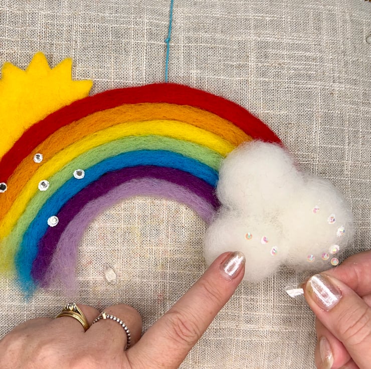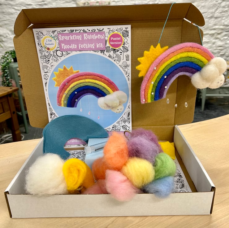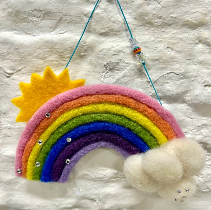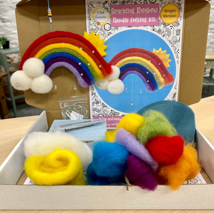 Your kit contains: sheet felt, felting mat and needles, 7 colours of carded wool, plus white and yellow for the clouds and sun, hanging cord, silver colour thread, acrylic gems, assorted beads, and iridescent glass 'raindrops". Also included is a full colour, step by step instruction booklet with photos to help you complete your project.