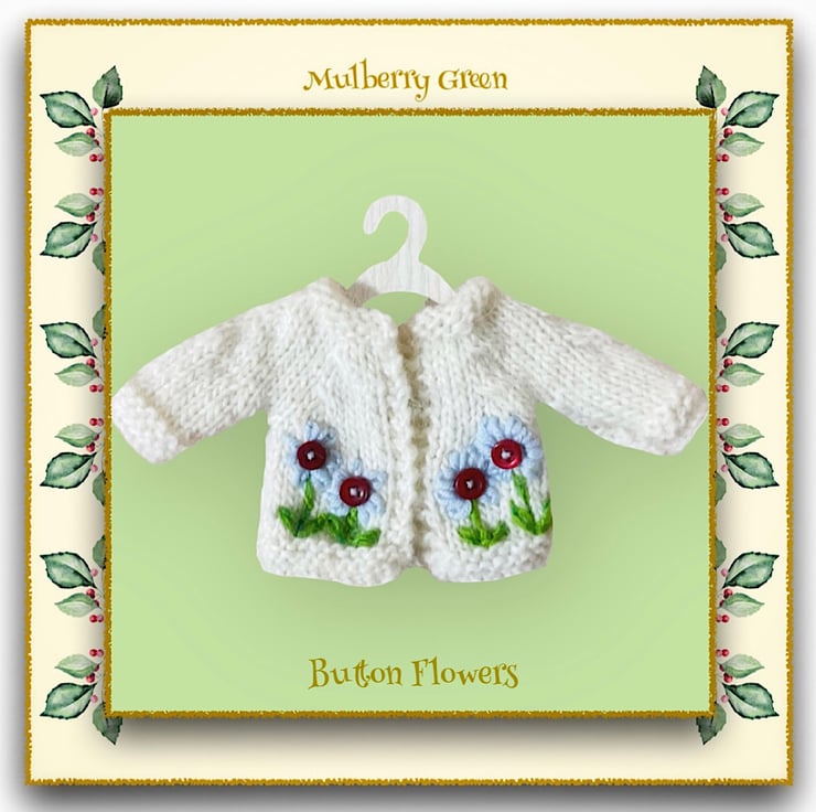 A lovely little Winter white cardigan with embroidered button flowers, to fit the Mulberry Green characters. The cardigan is hand knitted in pure Icelandic wool.