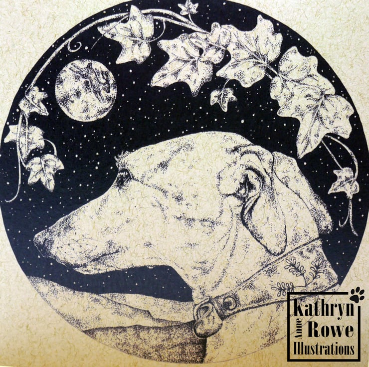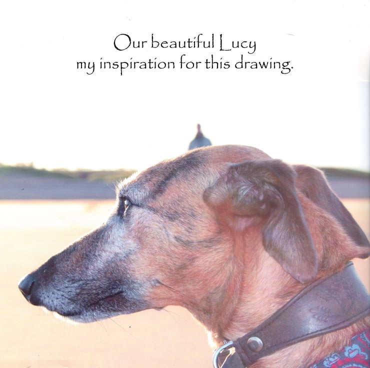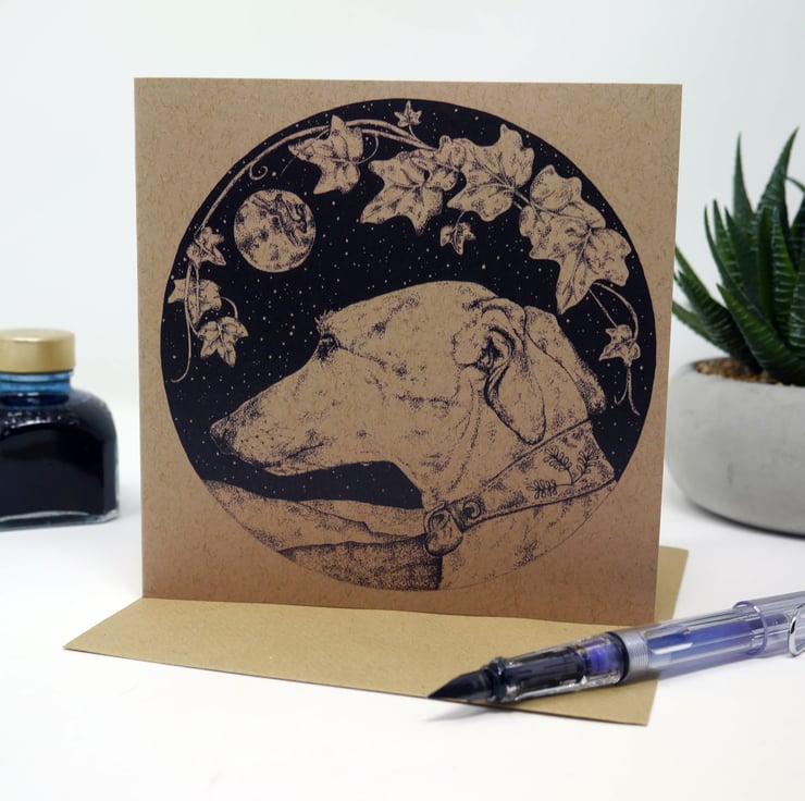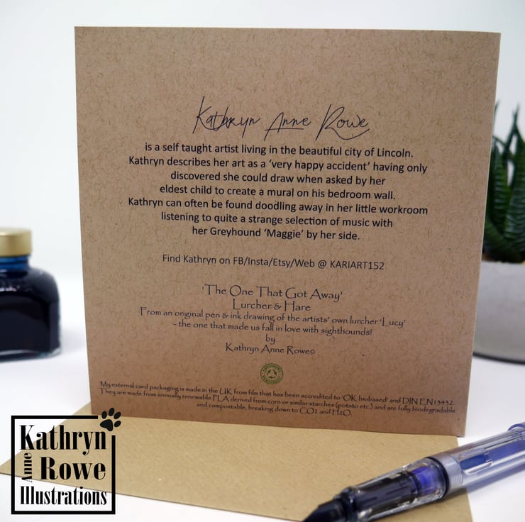 Lurcher greeting card featuring my pointillism ink drawing of our very own beautiful Lucy the Lurcher - the drawing is entitled 'The One That Got Away' in reference to the 'not so hidden' other animal escaping in the drawing.