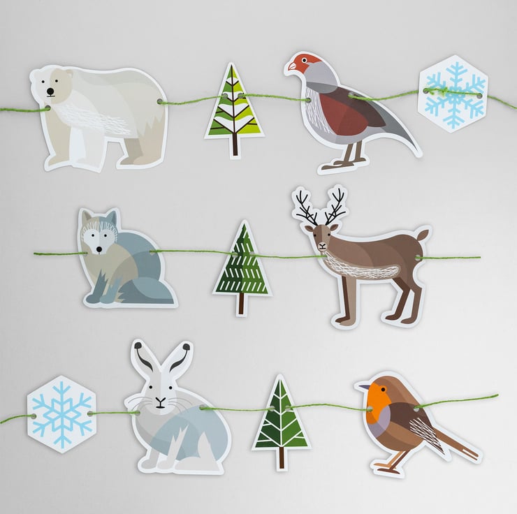 This garland is made of six Winter animals, two snowflakes and three fir trees. It features polar bear, partridge, Arctic fox, reindeer, Arctic hare and robin.