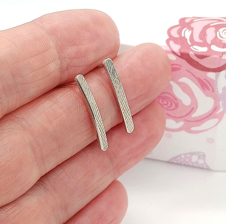 Textured Sterling silver bar stud earrings with a slight curve adding a touch of contemporary with traditional, the texture design is of angled stripes going across from side to side covering the full length of the earrings.