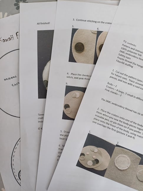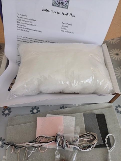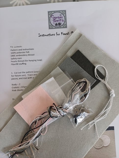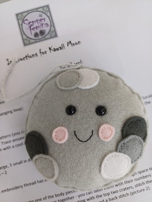 Each kit contains the supplies that you need to hand sew TWO Kawaii moon decorations: one for you and one to give away.