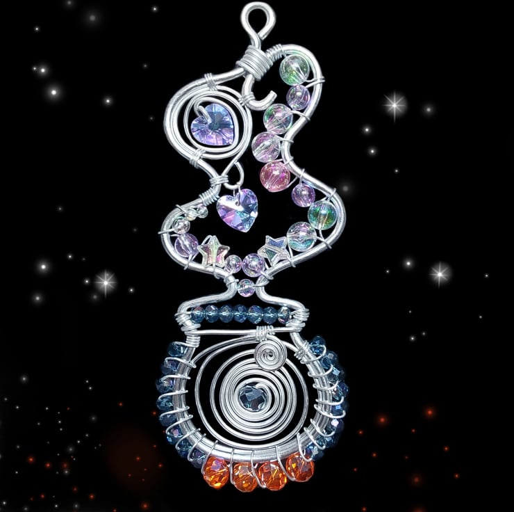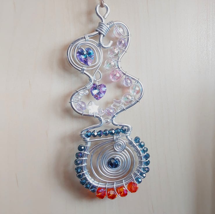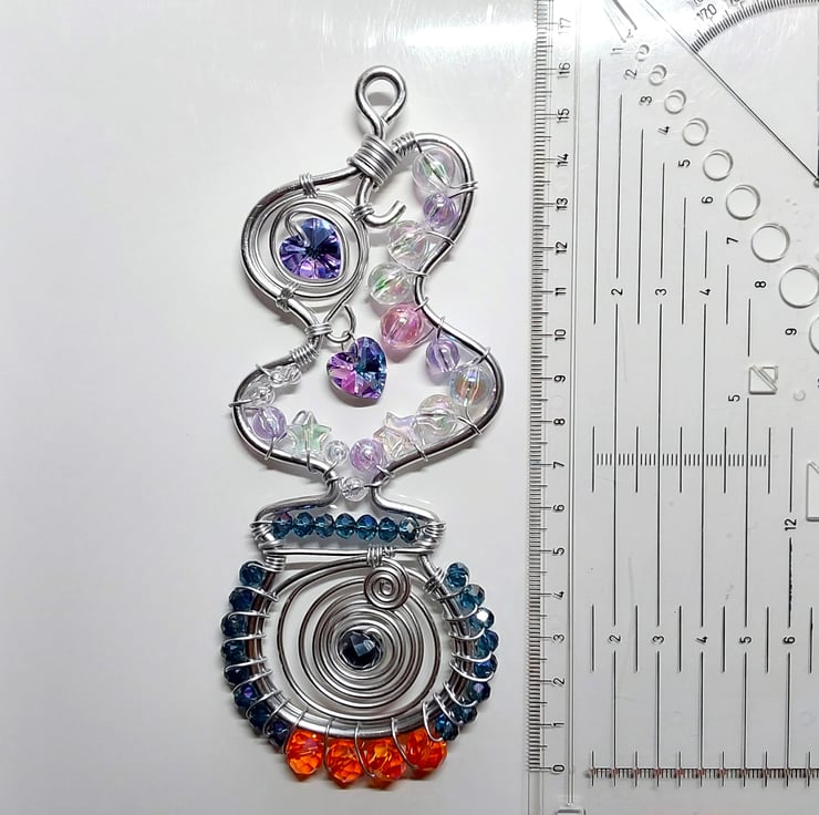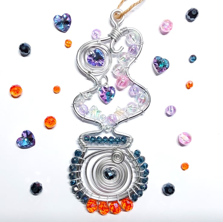 It is made from chunky 3 mm aluminium wire and various sizes, shapes and colours of beads including 2 purple/lilac crystal faceted hearts.