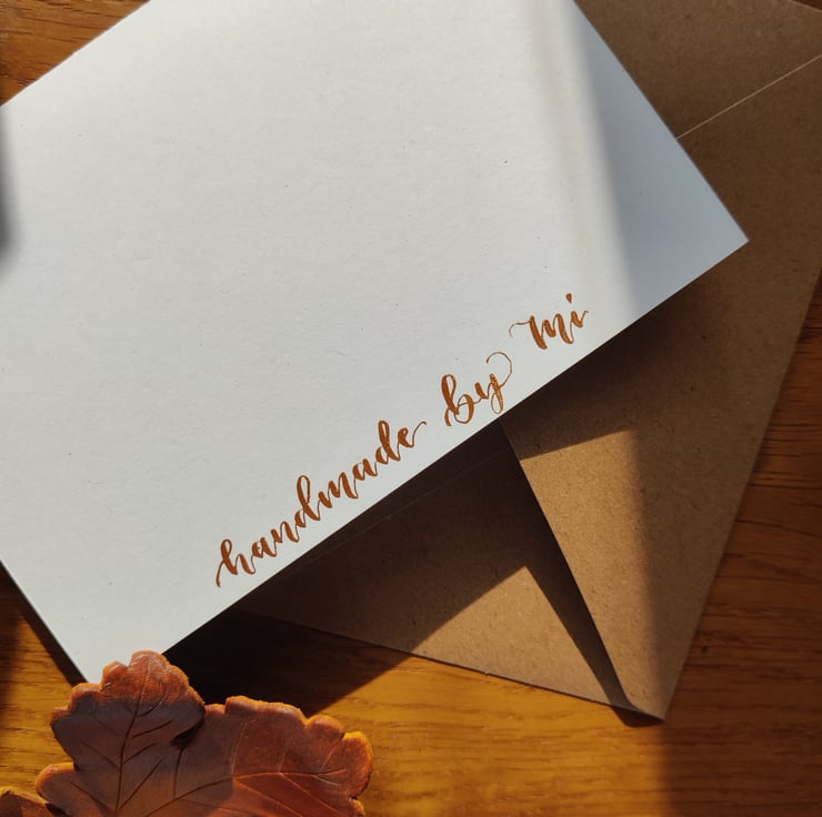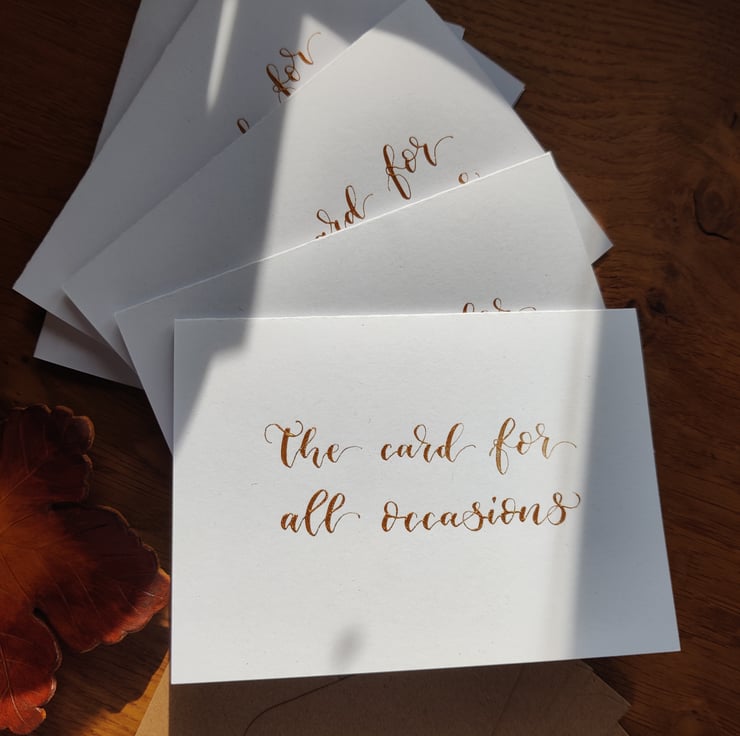This pack of 5 greeting cards is made with handmade calligraphy using a dip pen with gold ink.