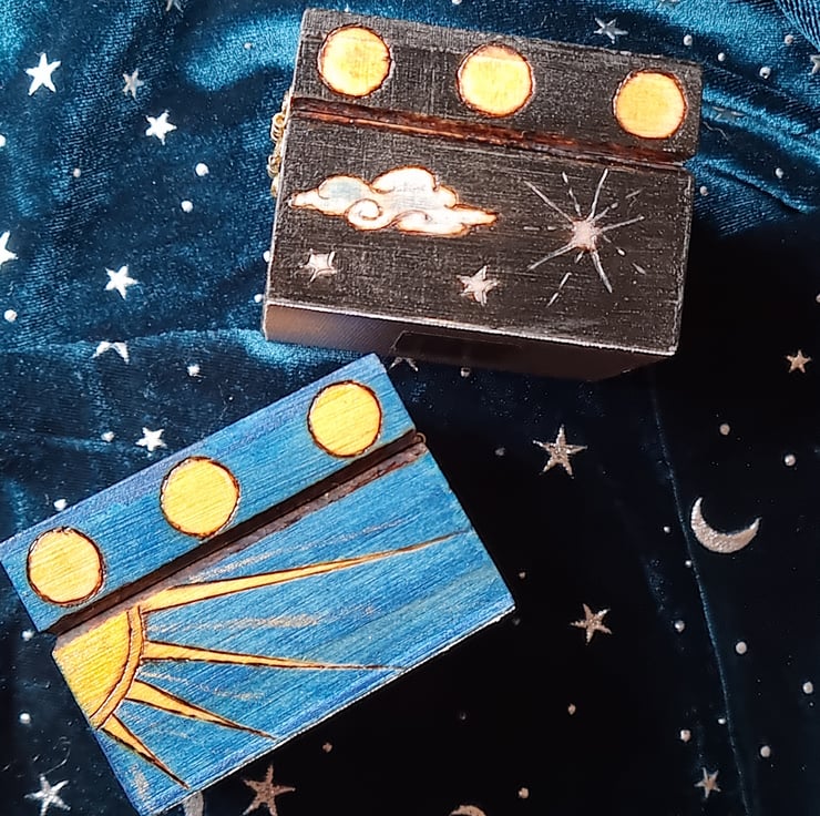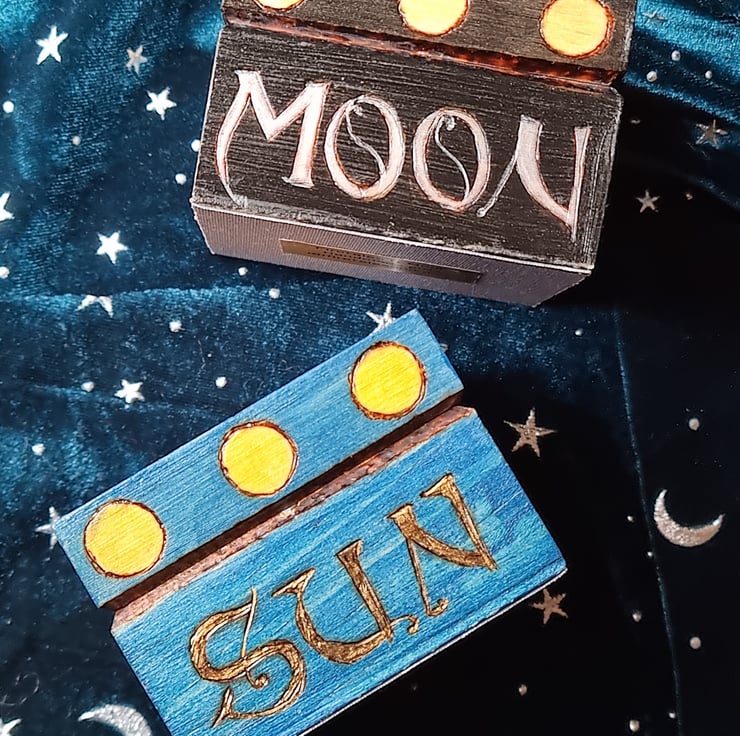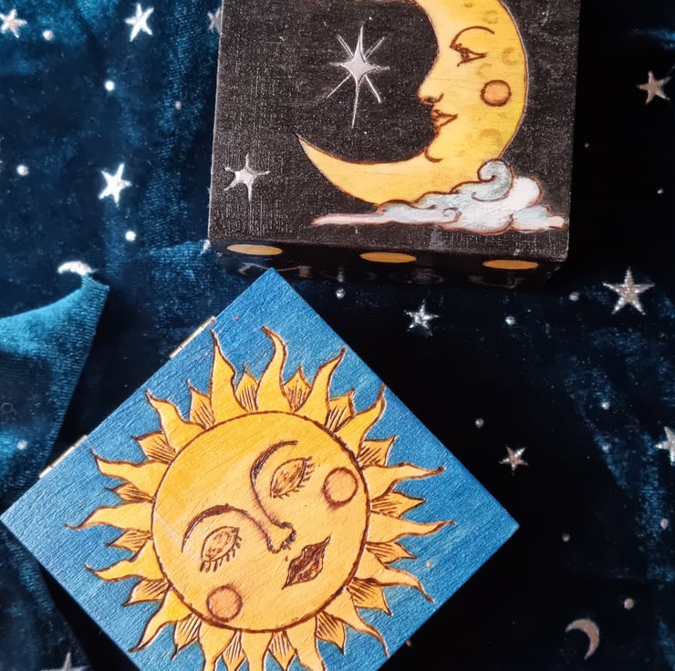 Wood burned with Sun and Moon designs, then hand painted.