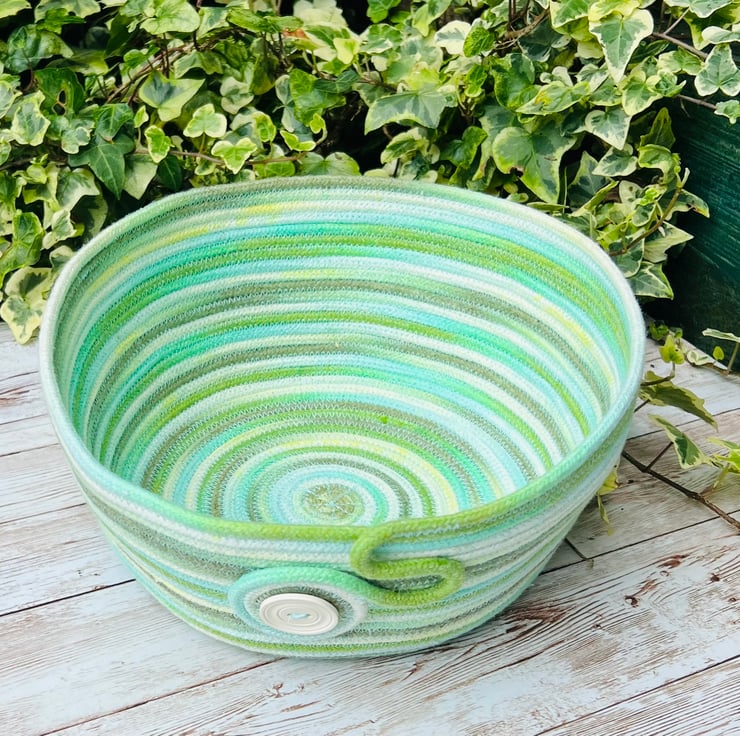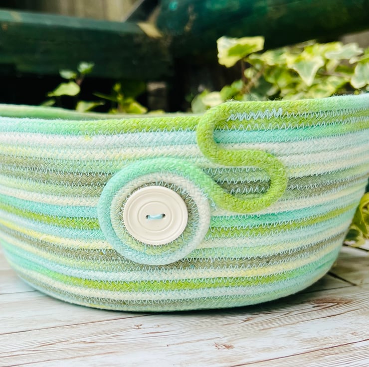 Variegated green, hand dyed, semi rigid, cotton cord bowl with vintage button detail.