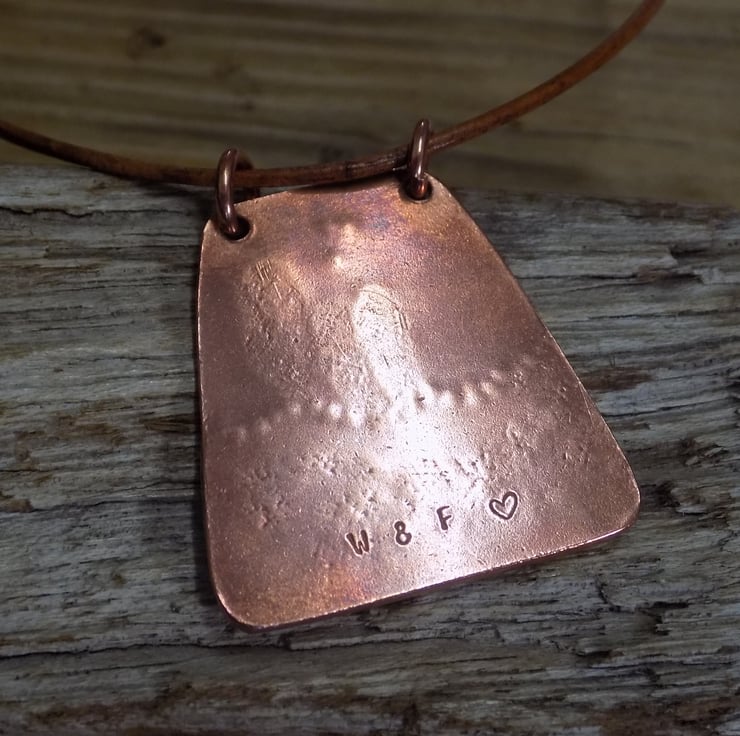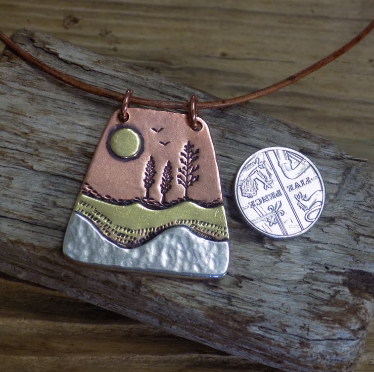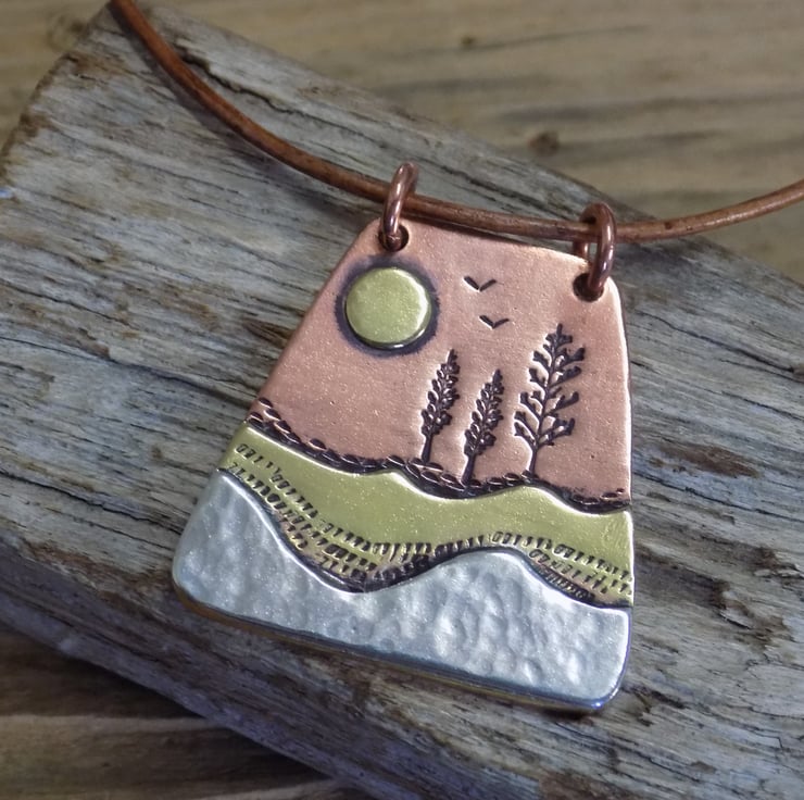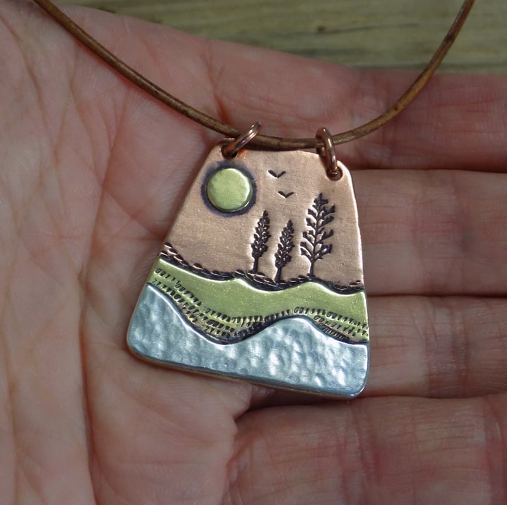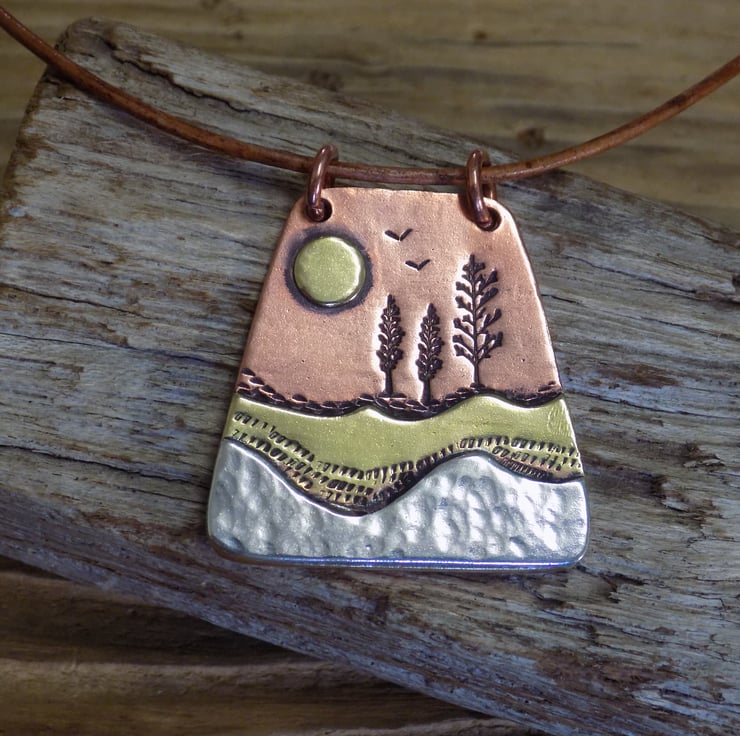 Made from thick copper overlaid with brass and sterling silver sheet . Made to look like an autumnal scene with golden hills and a silver dappled foreground. Nestled within the hills are a few stamped trees, and various tiny marks all applied individually to give character to the piece. Tiny birds and a golden sun set the scene. Suspended on a vintage brown leather cord adjustable from 18-20" with a lobster clasp closure.