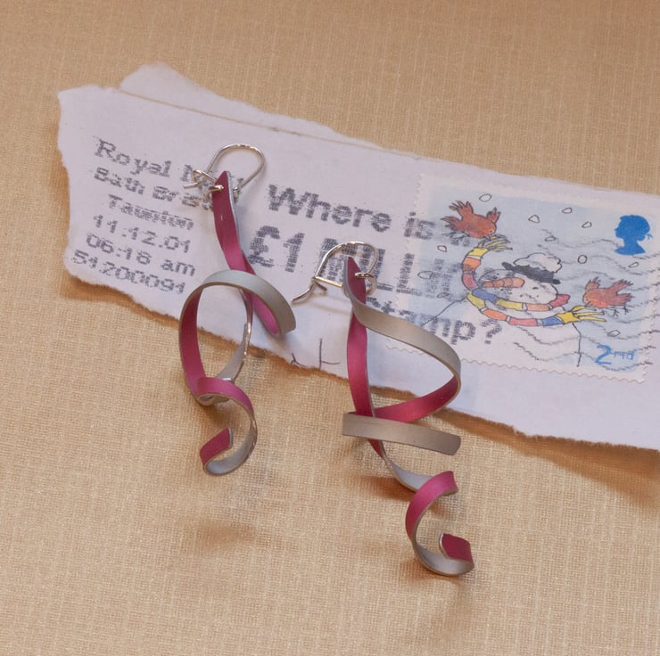 These fun earrings were inspired by twisted xmas ribbons used to wrap presents. The sort that you can make spiral when you run some scissors down their length. What better jewellery to get you into a xmas mood ?