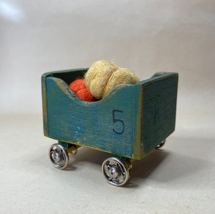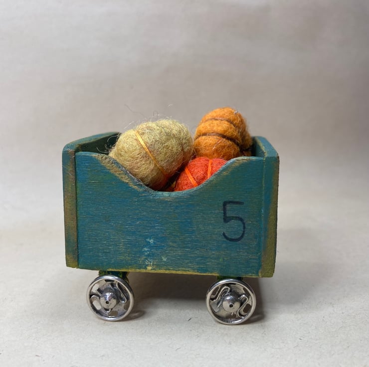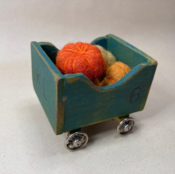Handmade mini truck with four felted pumpkins. I make my trucks and trollies from Balsa wood. I then paint and distress them to create a vintage feel. The wheels do work. However, this item is not a toy and not suitable for children due to the small parts.