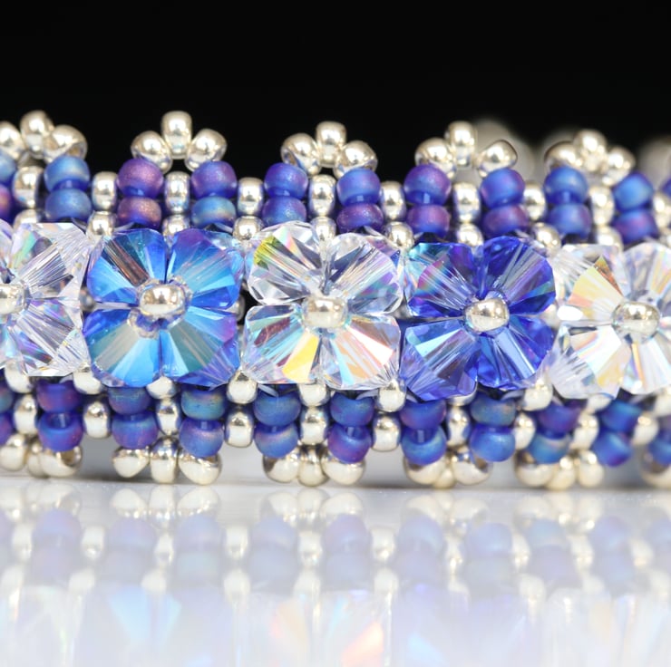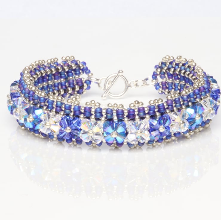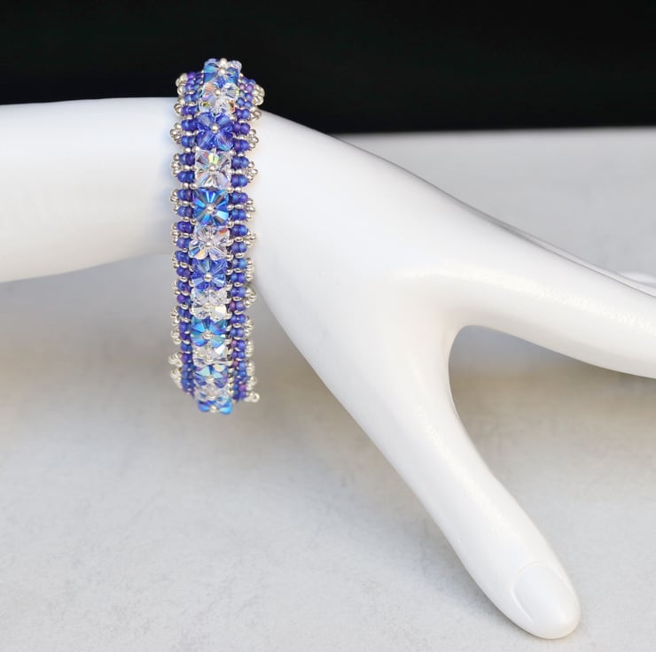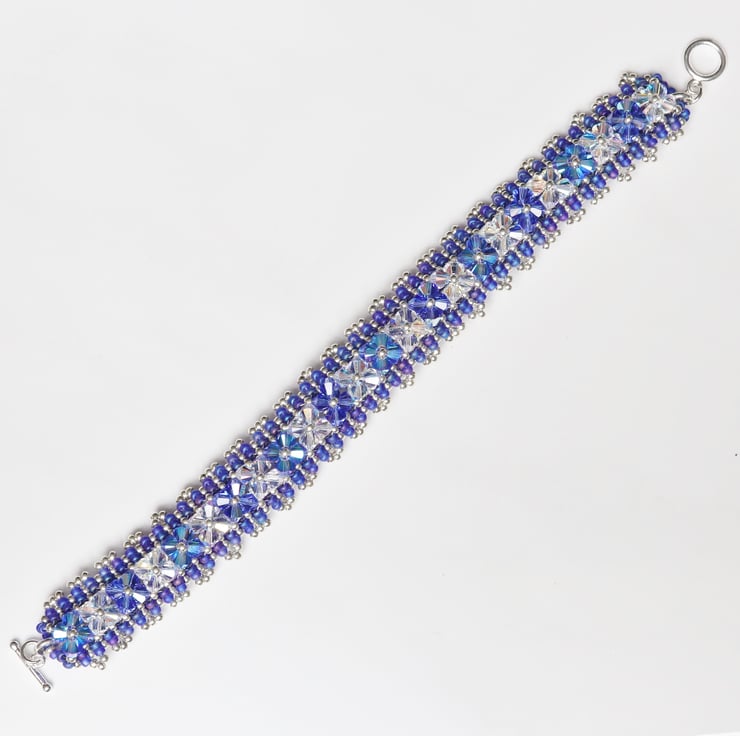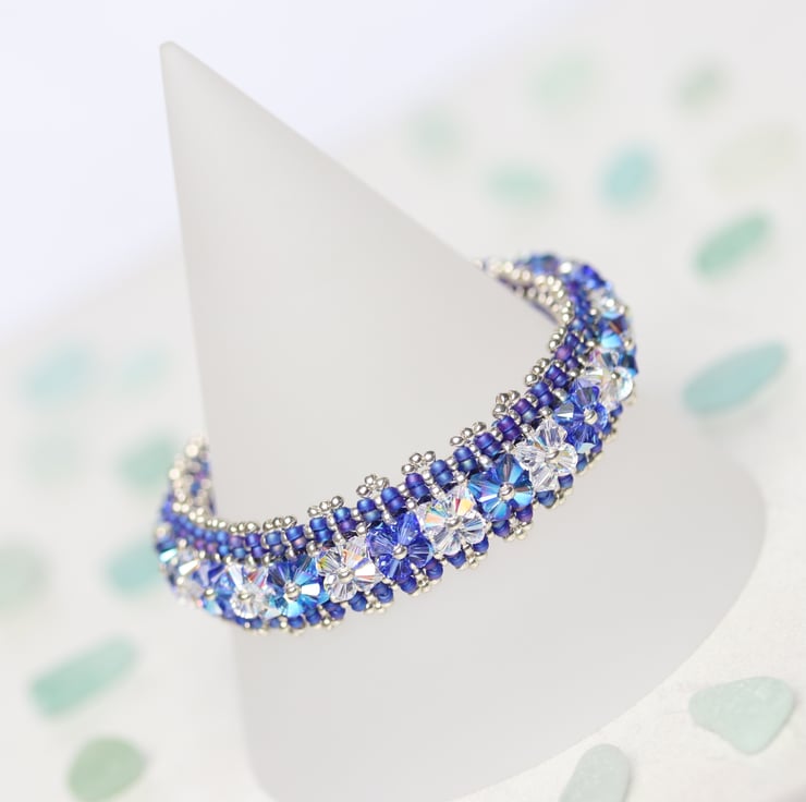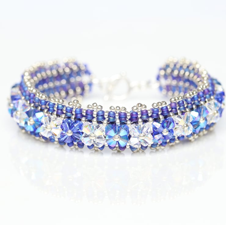 This is a very sparkly Swarovski crystal bracelet which would make a gorgeous gift for a special occasion such as a Sapphire Wedding Anniversary. It is made from tiny seed beads in dark blue and silver colours, embellished with pretty Swarovski bicone crystals in sapphire blue and crystal. Some of the crystals have an AB or 2AB coating for extra iridescence. The bracelet is finished with a little sterling silver toggle clasp.