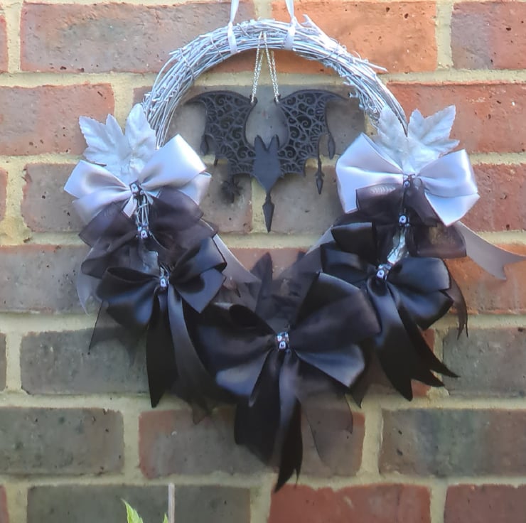 Wreath is rattan and approx 30cm wide, decorated with Silver and Black paint, ribbons and leaves with a hanging resin bat. Wreath hangs on a Silver ribbon tied at the top.