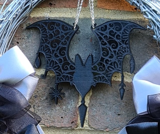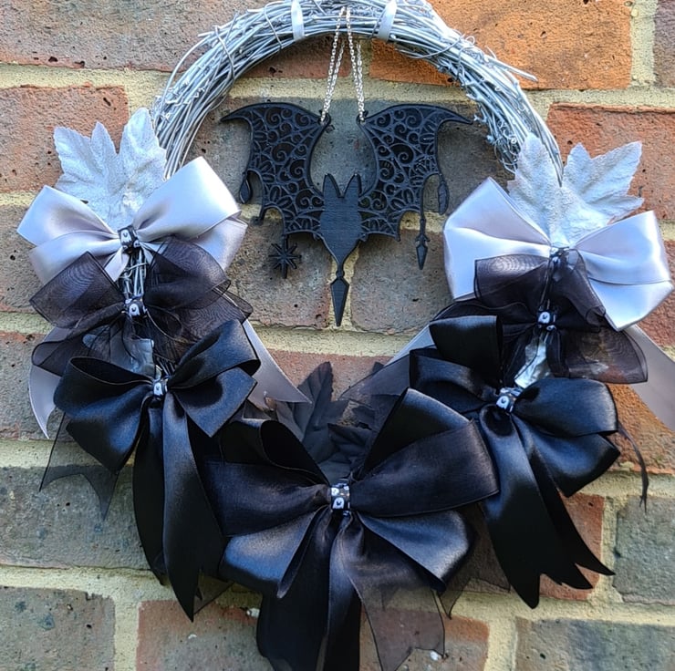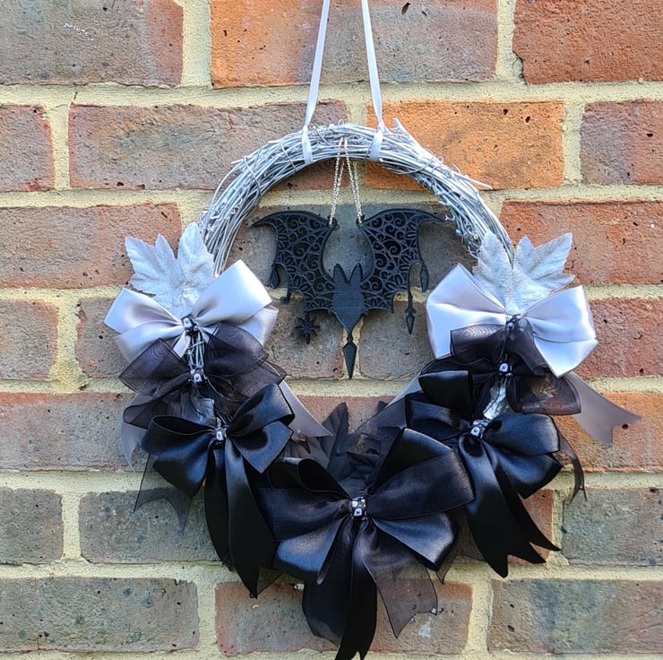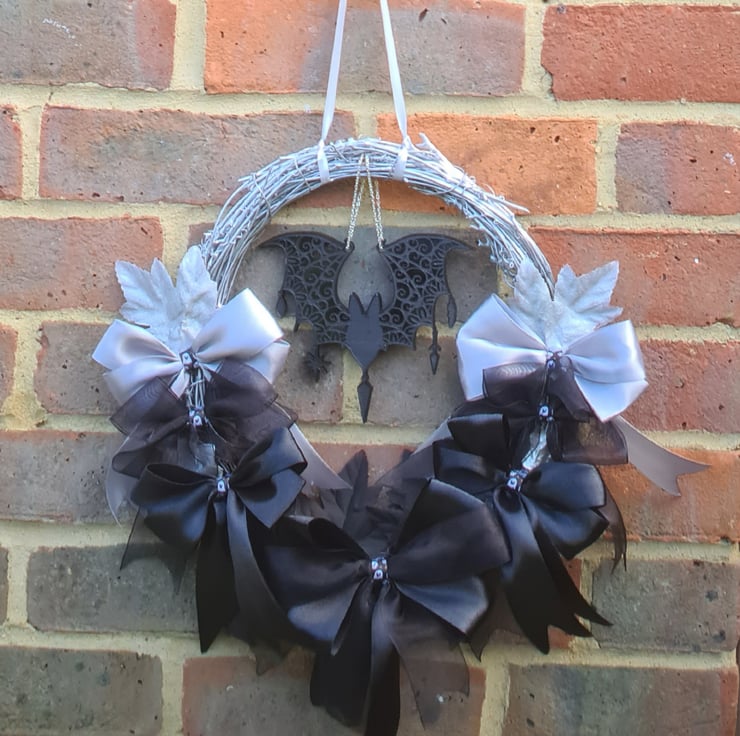 Wreath is rattan and approx 30cm wide, decorated with Silver and Black paint, ribbons and leaves with a hanging resin bat. Wreath hangs on a Silver ribbon tied at the top.