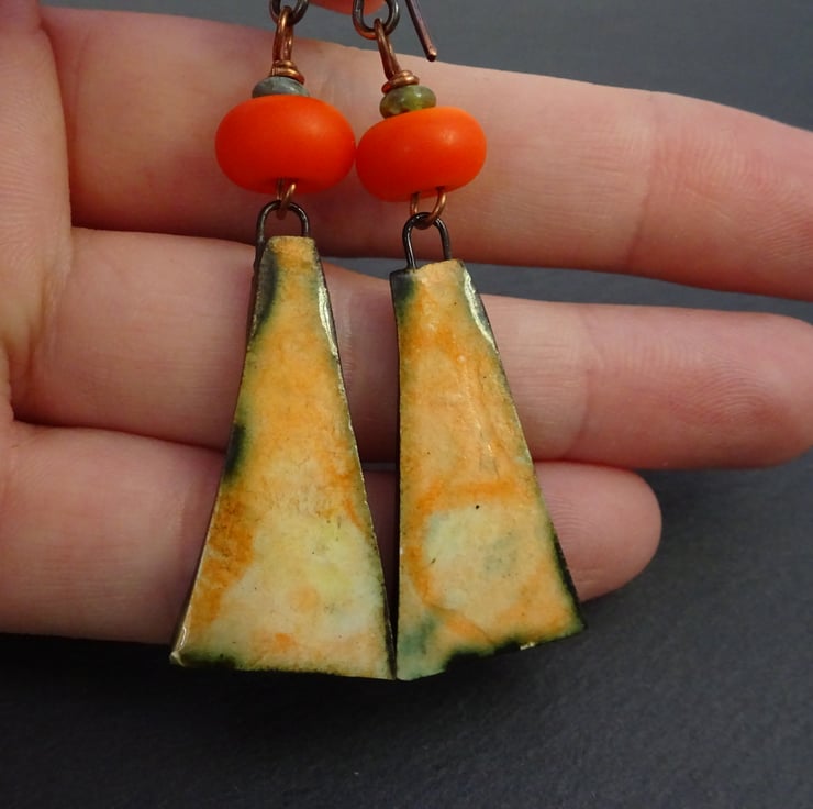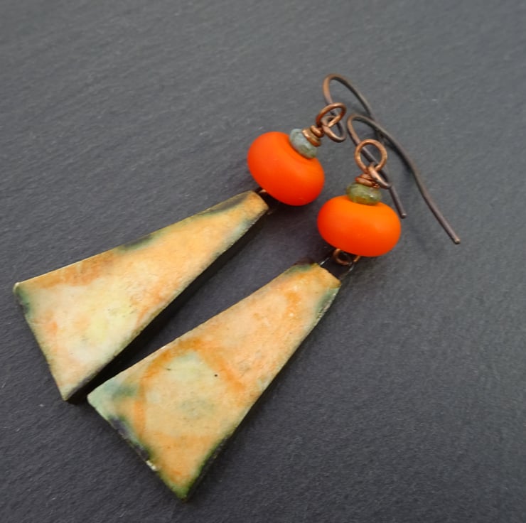 A pair of earrings made with handmade copper ear wires, handmade lampwork glass beads and handmade ceramic drops with an orange tie dye pattern.