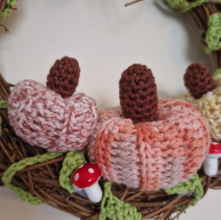 This decorative wreath measures 8 inches. Decorated with crocheted vine leaves and pumpkins and cute mini mushrooms. Comes with a ribbon for hanging.