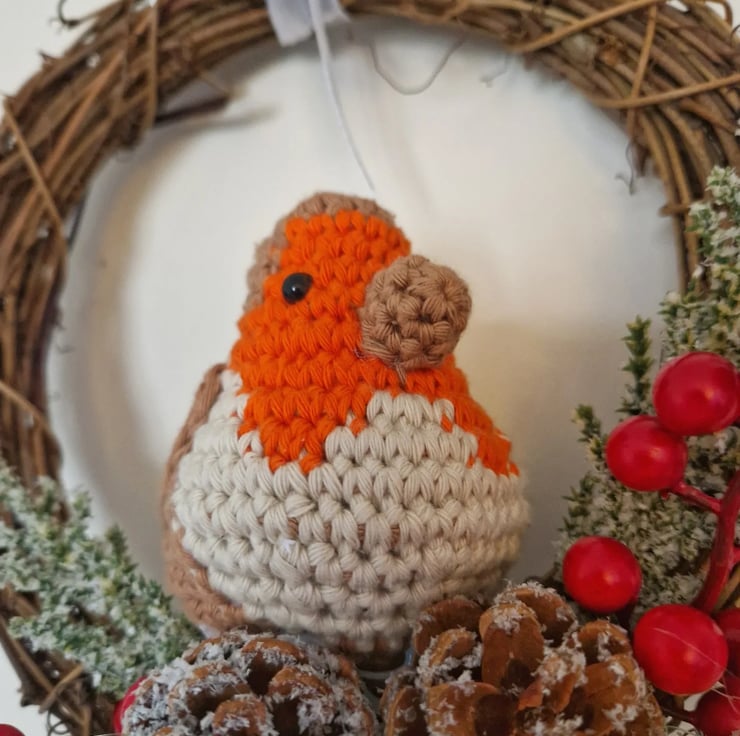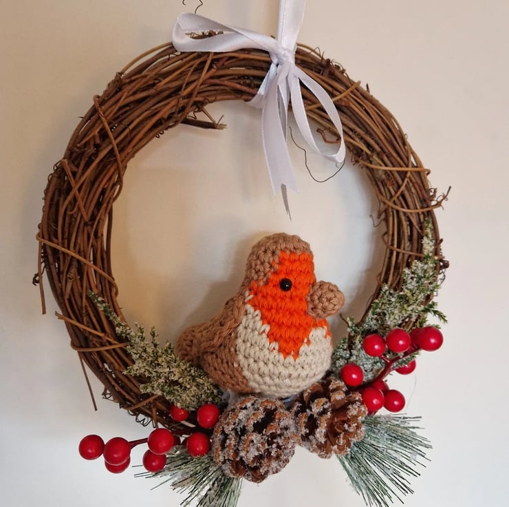 This decorative wreath measures 8 inches and is decorated with a hand crocheted robin as well as winter items. The wreath also has a ribbon for hanging.