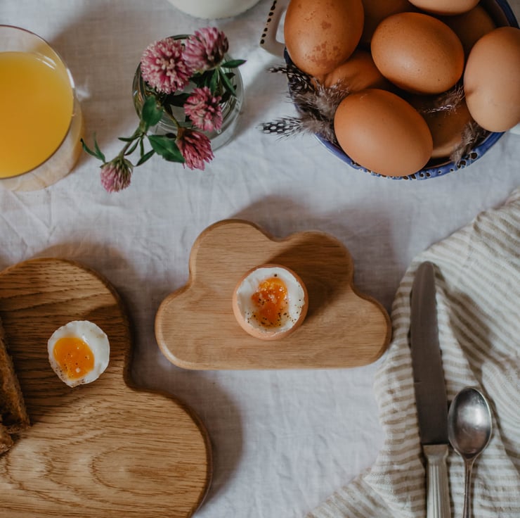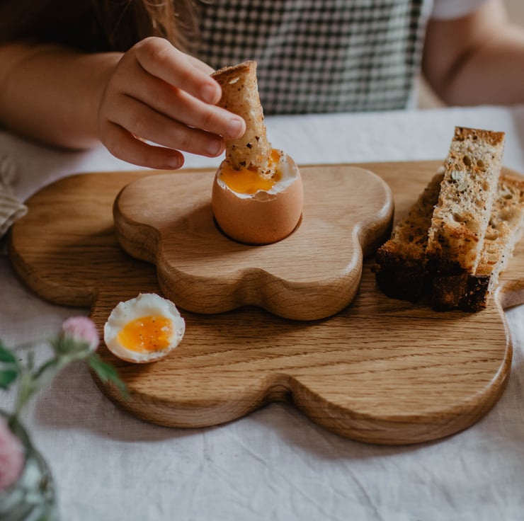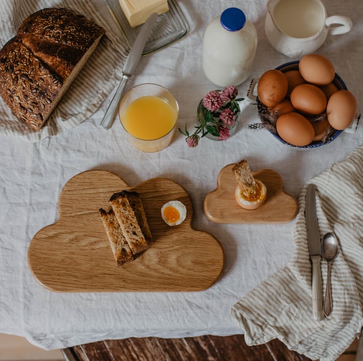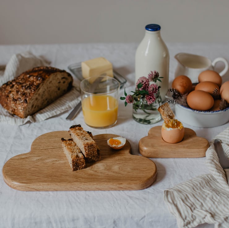 Make breakfast time fun with our enchanting children's breakfast sets with a wooden toast board & matching chunky oak egg cup in an adorable cloud design, here to hold little one's hard-boiled eggs & toast for the perfect breakfast of dippy eggs & soldiers.