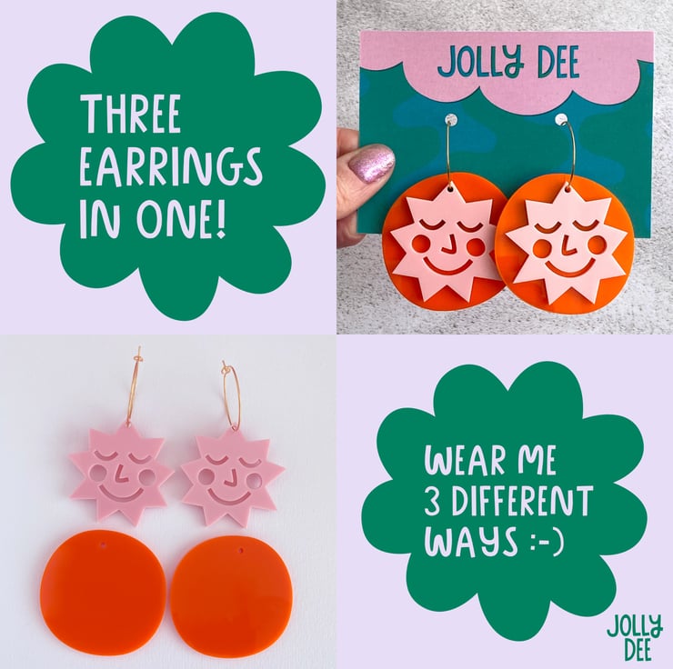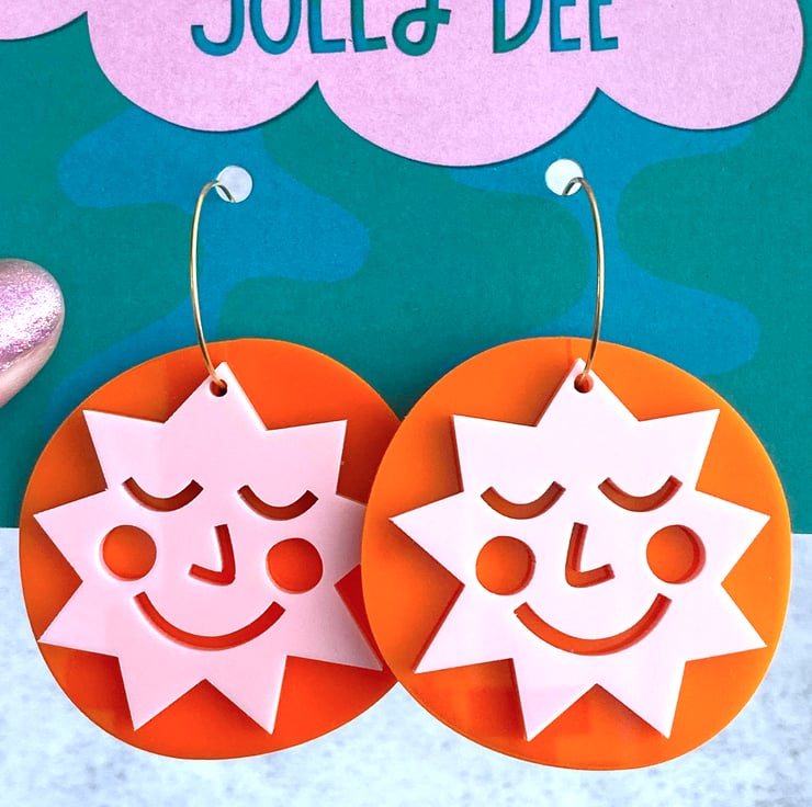 A pair of Jolly Dee acrylic earrings for women make great statement earrings for your wardrobe. My unique hand drawn happy sun face design was laser cut from lightweight acrylic perspex. The sun face is laser cut out of the pink acrylic, showing the orange acrylic behind.