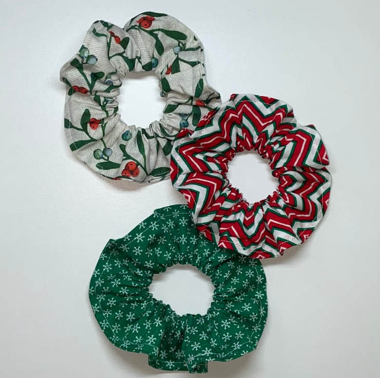 A great stocking filler or treat yourself. This is a trio of Christmas cotton scrunchies. There is a bright green scrunchie with snowflakes, a taupe one with mistletoe and one of beautiful Christmas colours.