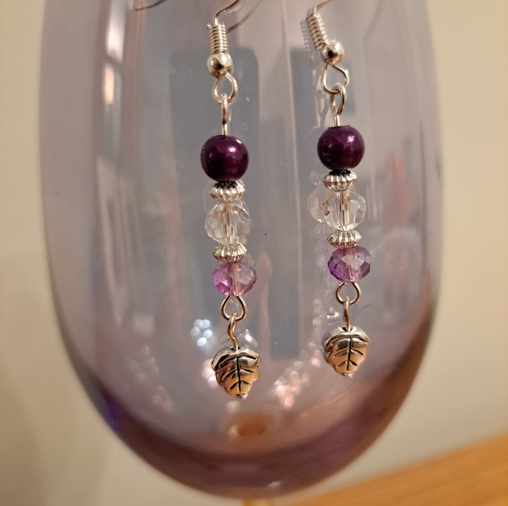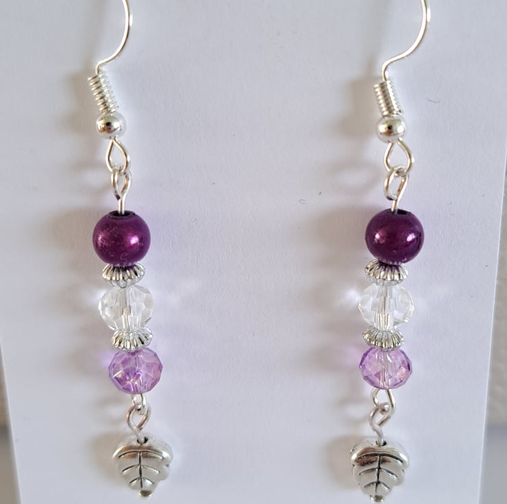 Handmade crystal drop earrings in shades of purple. Each silver plated wire hook presents a purple miracle bead, a clear & a lilac crystal faceted bead and a silver tone leaf bead. In an evening light, the miracle bead takes on a deep purple colour, but in sunlight it looks paler, glistening almost like a pearl. These earrings would be a lovely addition to anyone’s jewellery collection for daily wear or a special occasion.