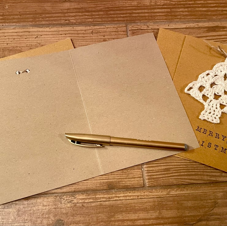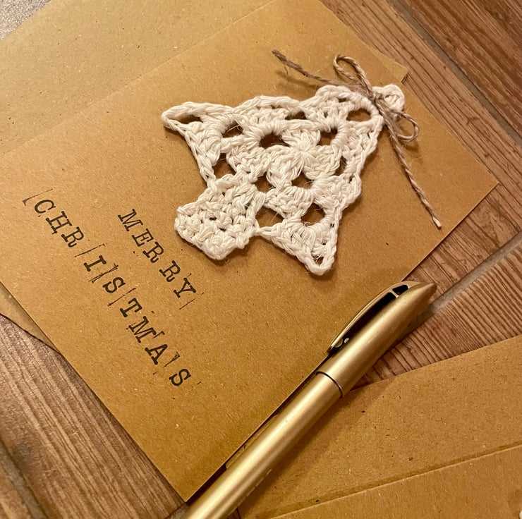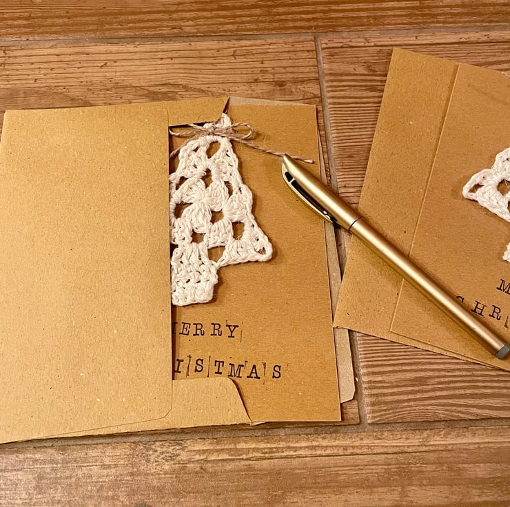 Each 5 x 7 inch card features a handmade crochet granny square stitch Christmas Tree using reclaimed cotton yarn that is detachable so you can use as a Christmas ornament. The “Merry Christmas” quirky print adds to the personality of these special cards. They will stand out in a Christmas card display and keep giving pleasure each Christmas with the simple tree ornament.