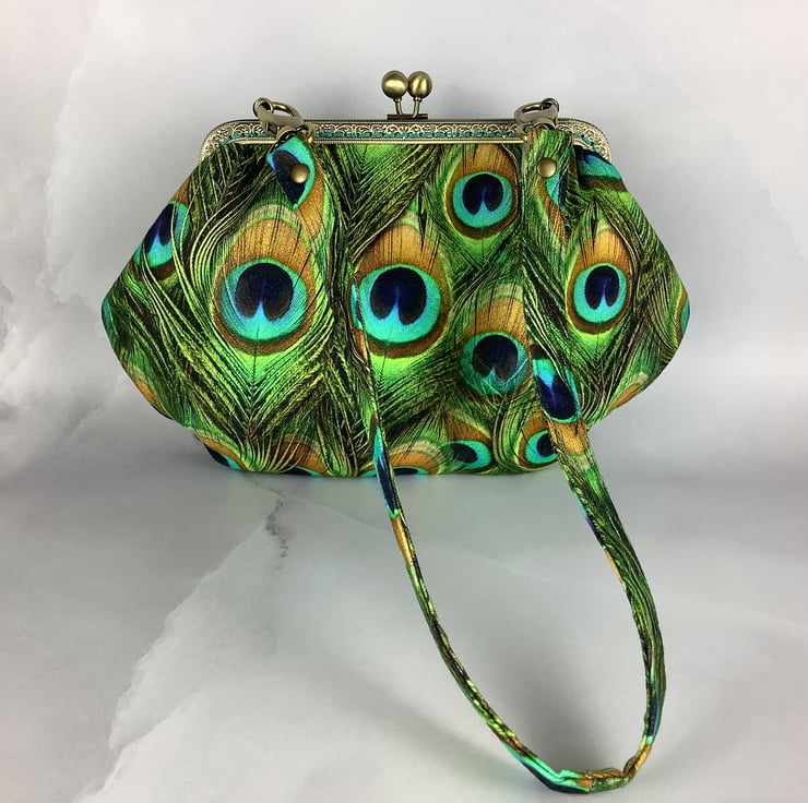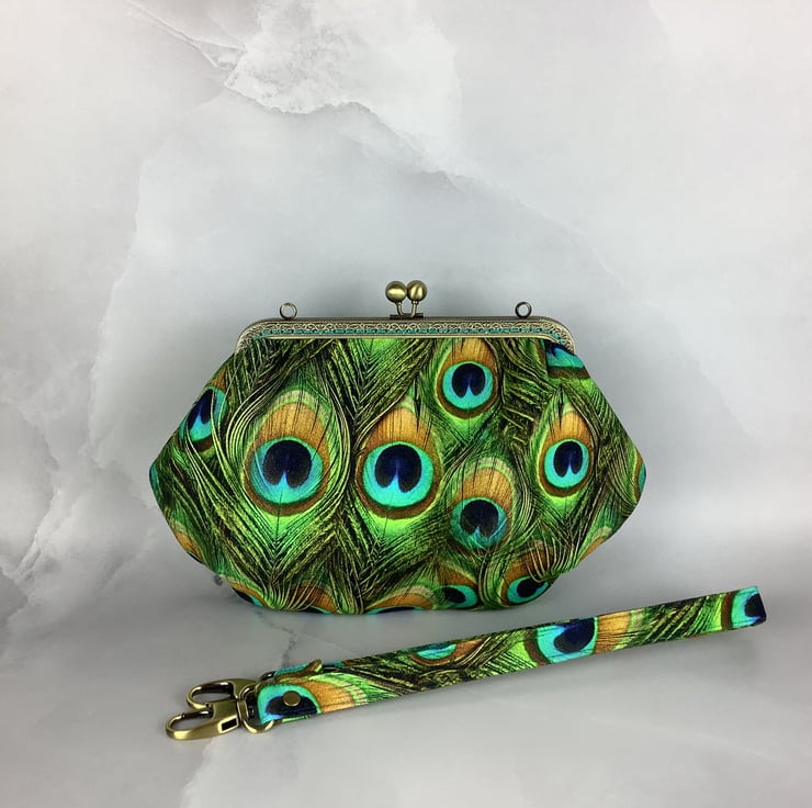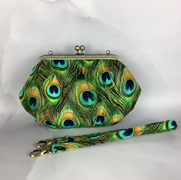 Peacock feathers medium clutch bag, Detachable strap, Handmade